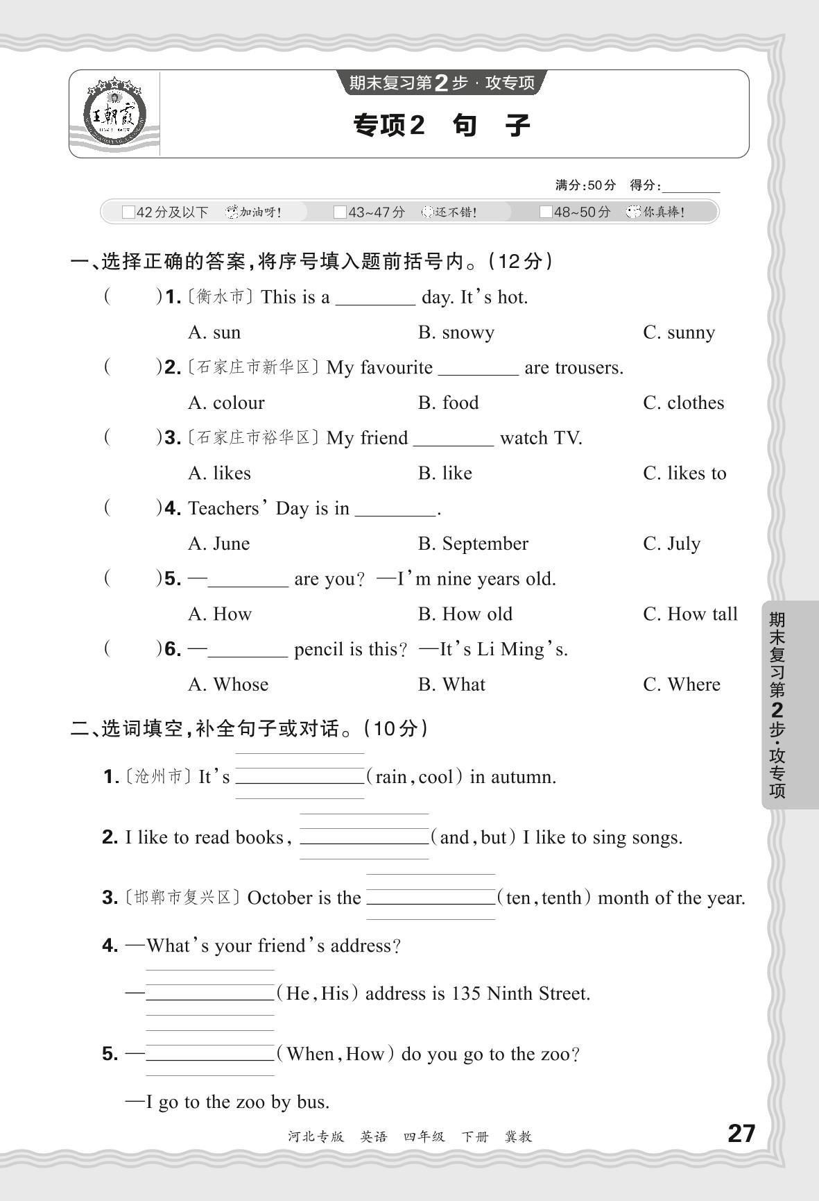 2024春下册四年级英语冀教版 期末专项卷河北版·句子【2】