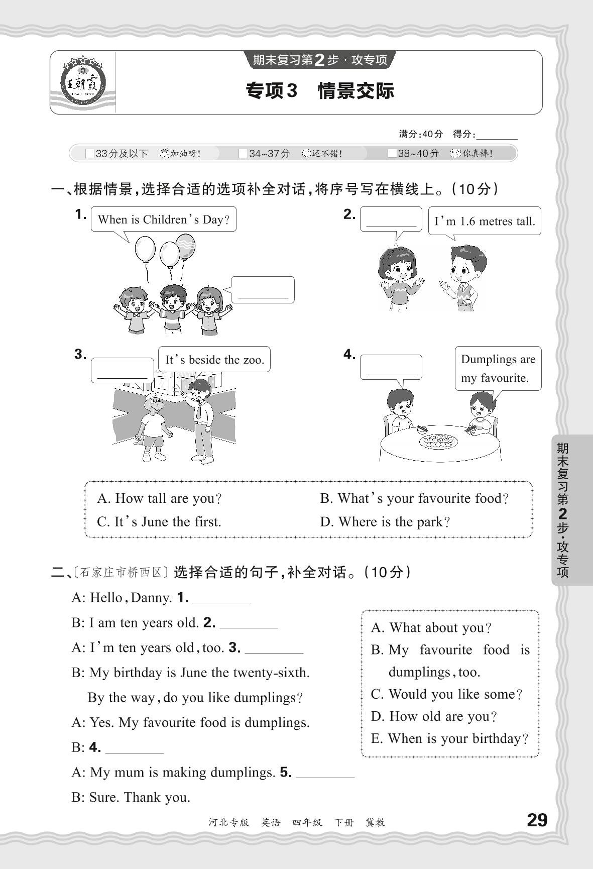 2024春下册四年级英语冀教版 期末专项卷河北版·情景交际【3】