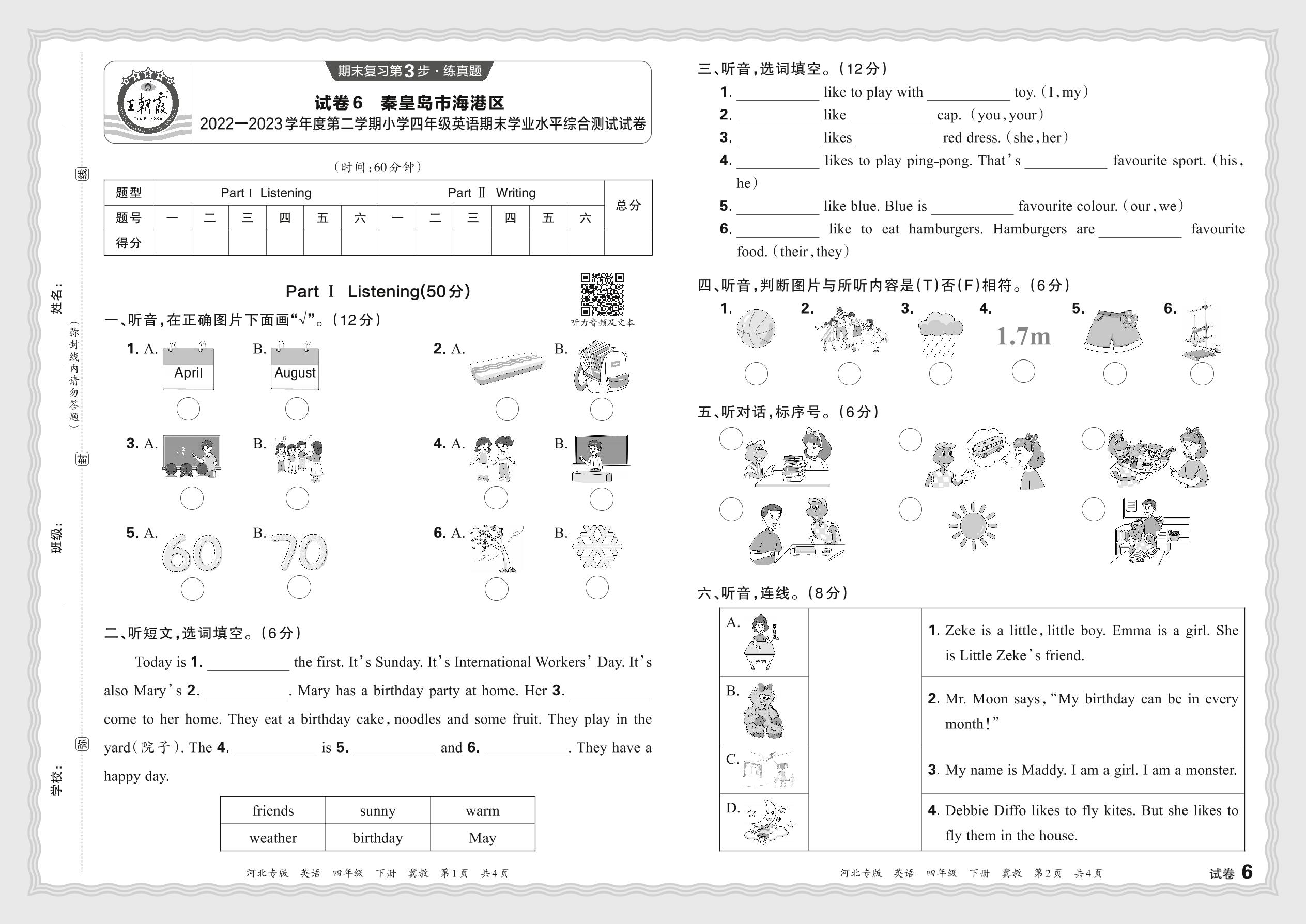 河北省秦皇岛市海港区2022—2023学年度第二学期小学四年级英语期末学业水平综合测试试卷(冀教版)【6】