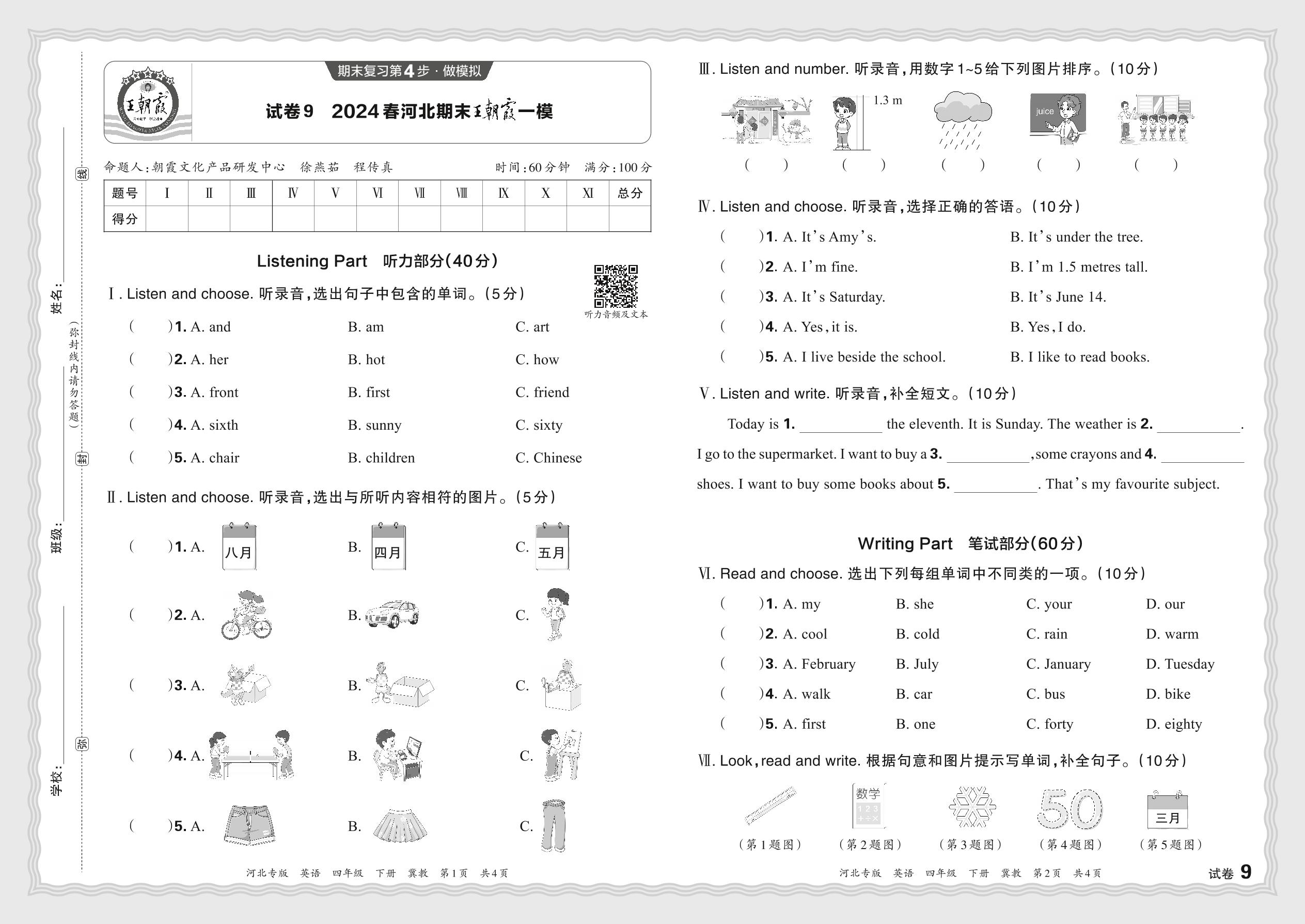 2024春下册四年级英语冀教版 河北期末王朝霞一模