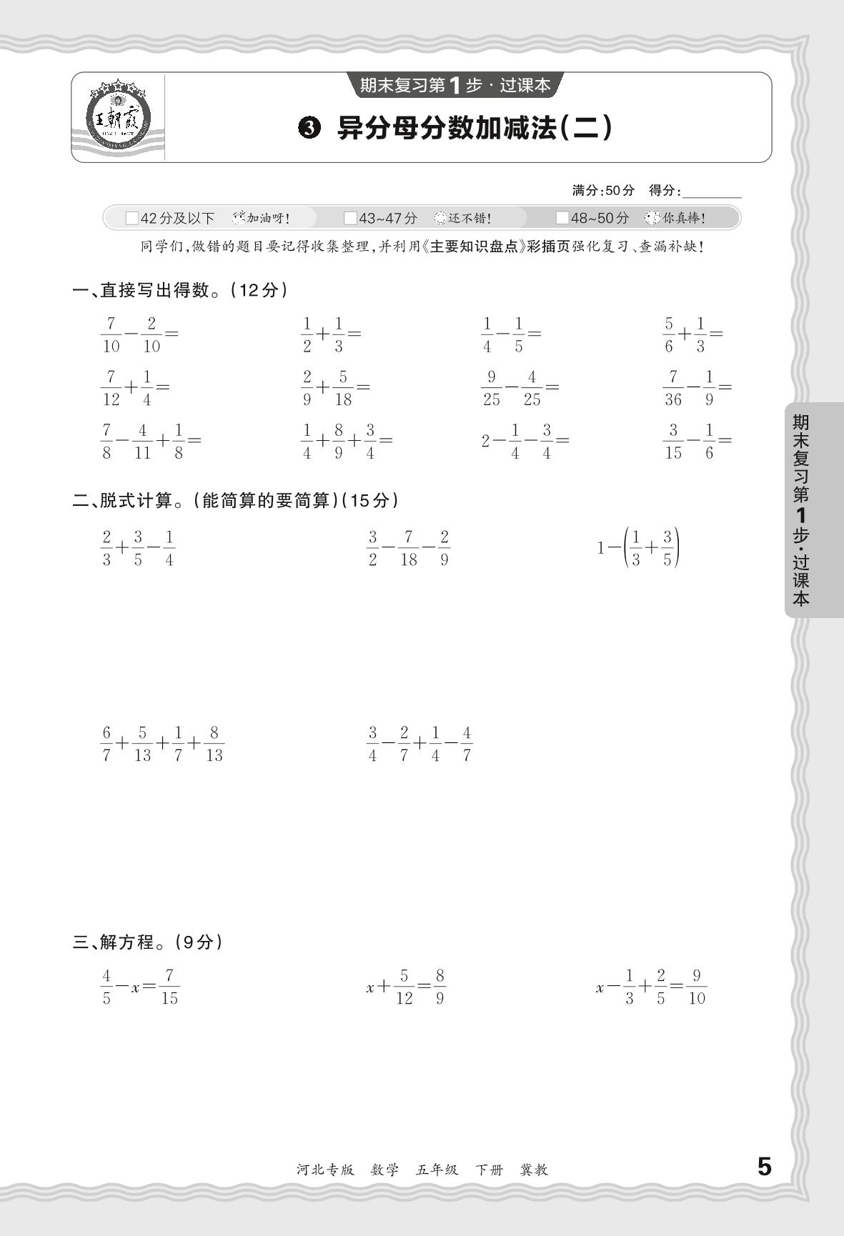 2024春下册五年级数学冀教版 期末过课本河北版·异分母分数加减法(二)【3】