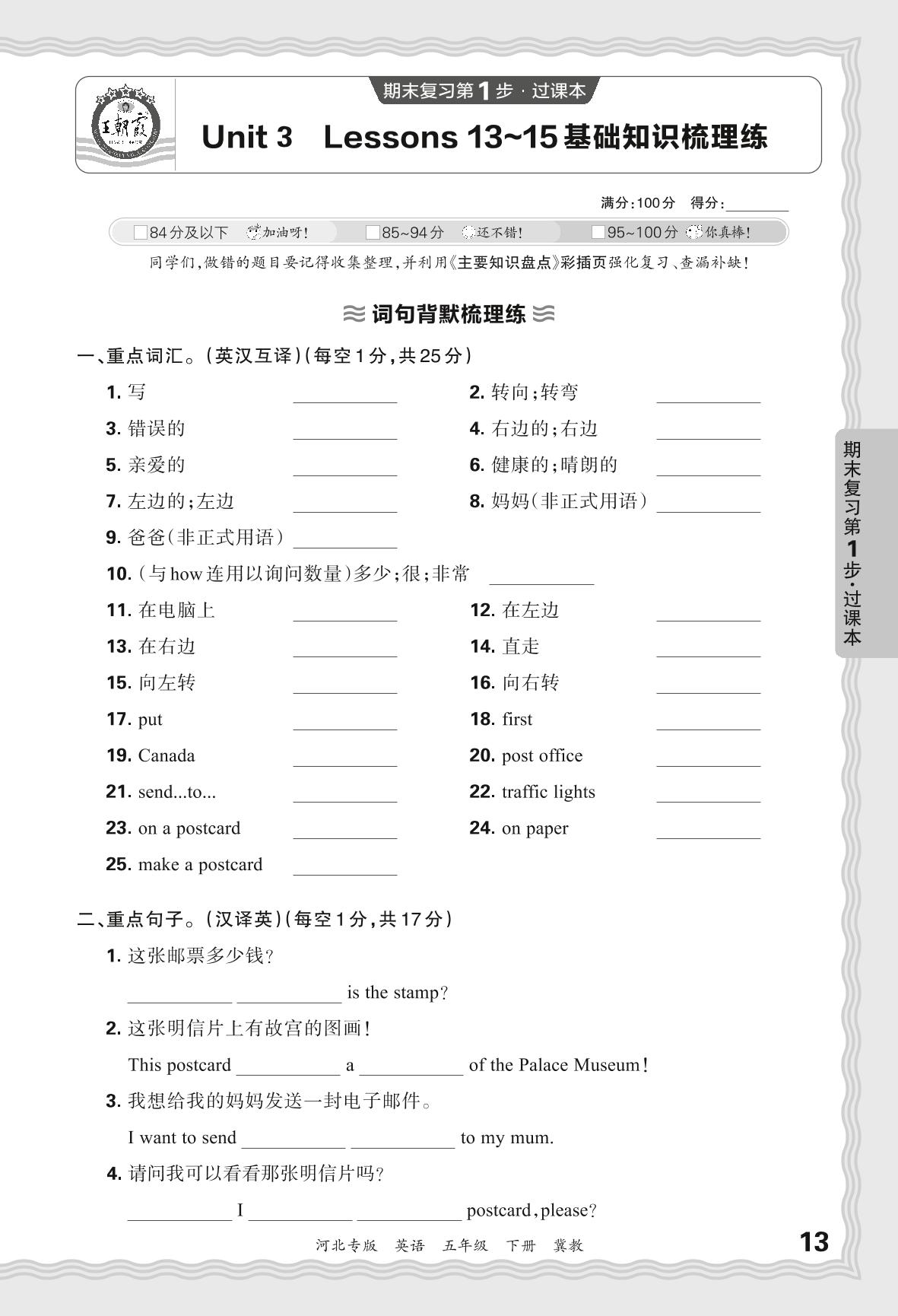 2024春下册五年级英语冀教版 期末过课本河北版·Unit 3 Lessons 13~15 基础知识梳理练