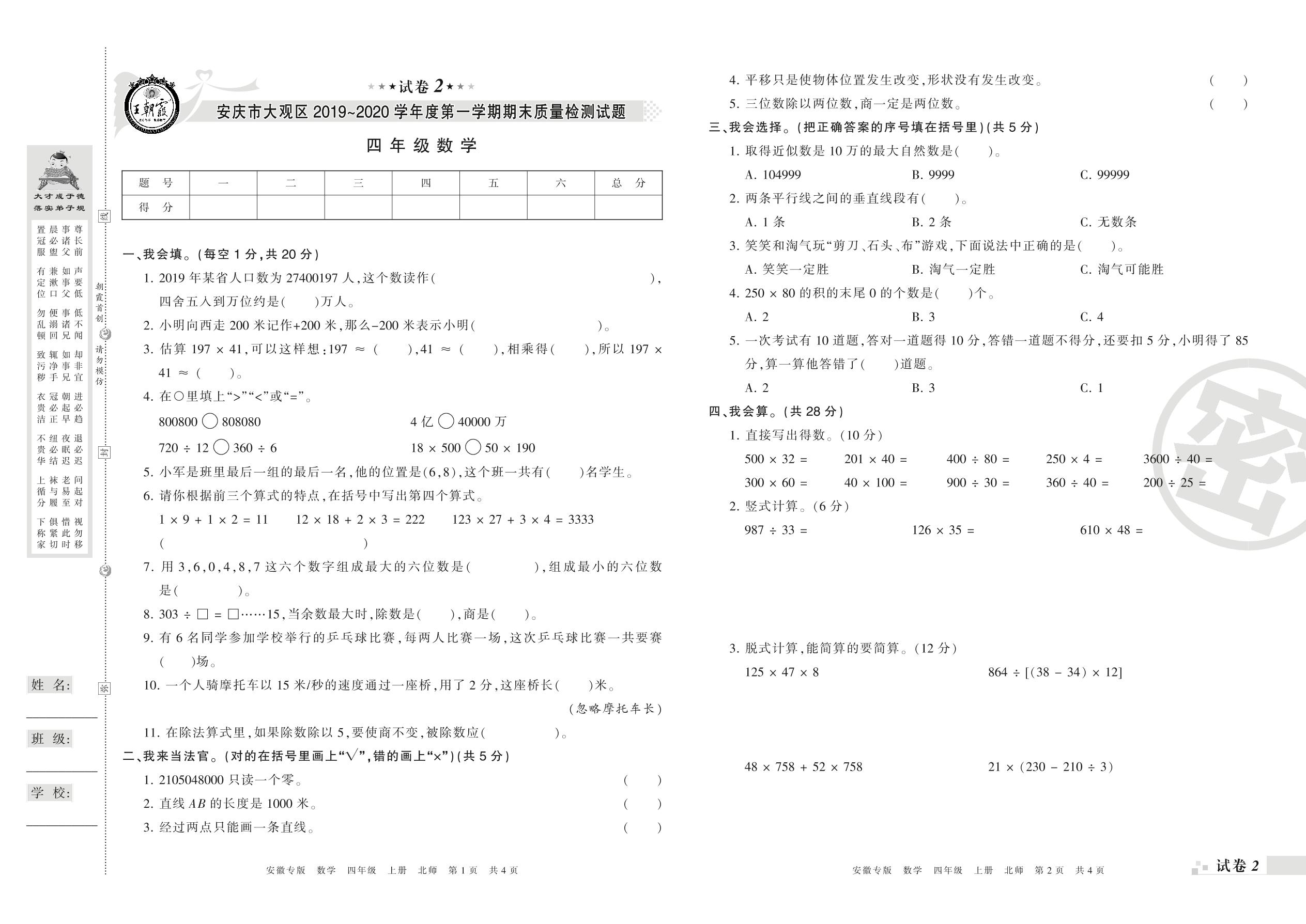 2019-2020学年第一学期安庆市大观区四年级数学试卷(北师版)【2】