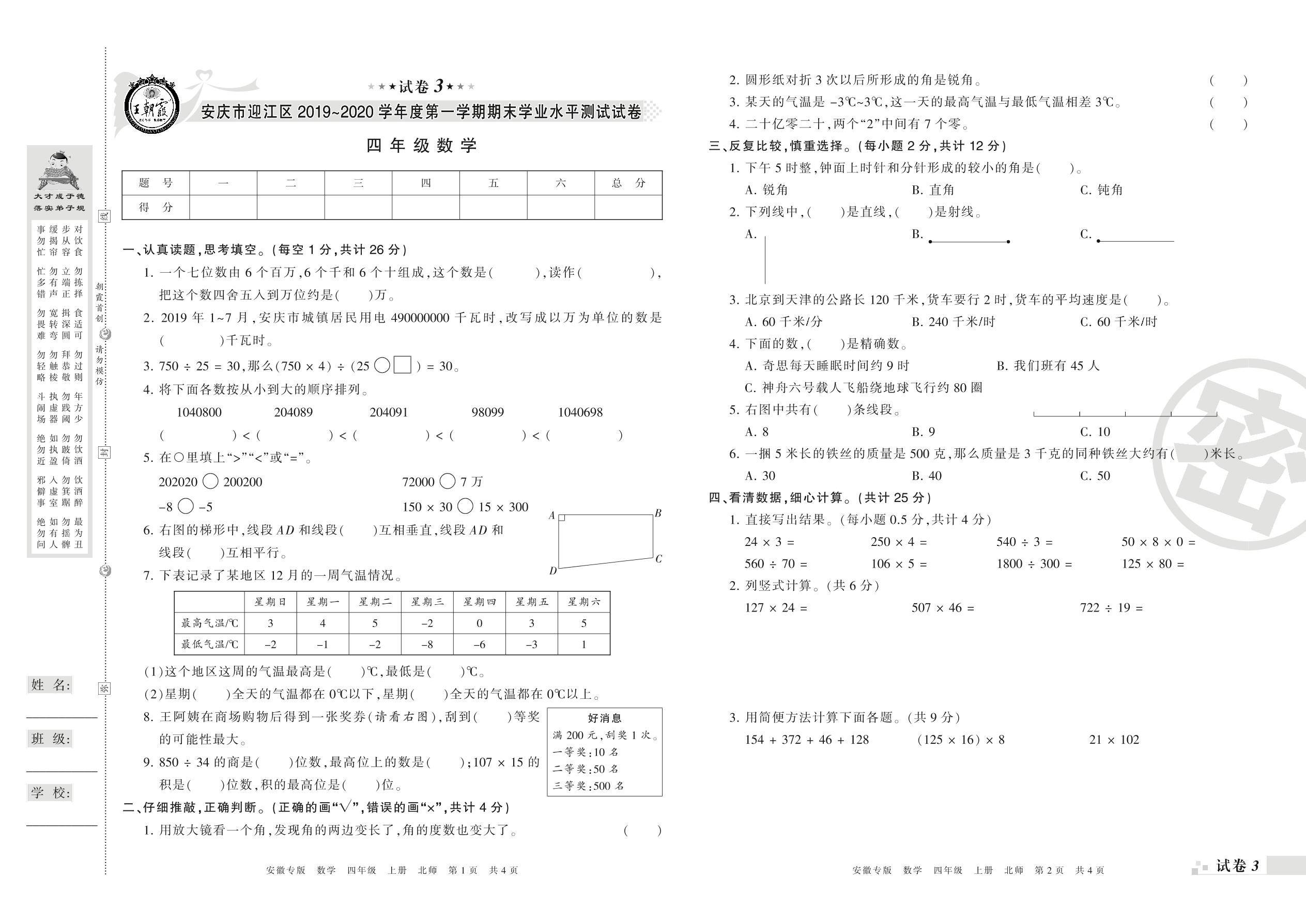 2019-2020学年第一学期安庆市迎江区四年级数学试卷(北师版)【3】