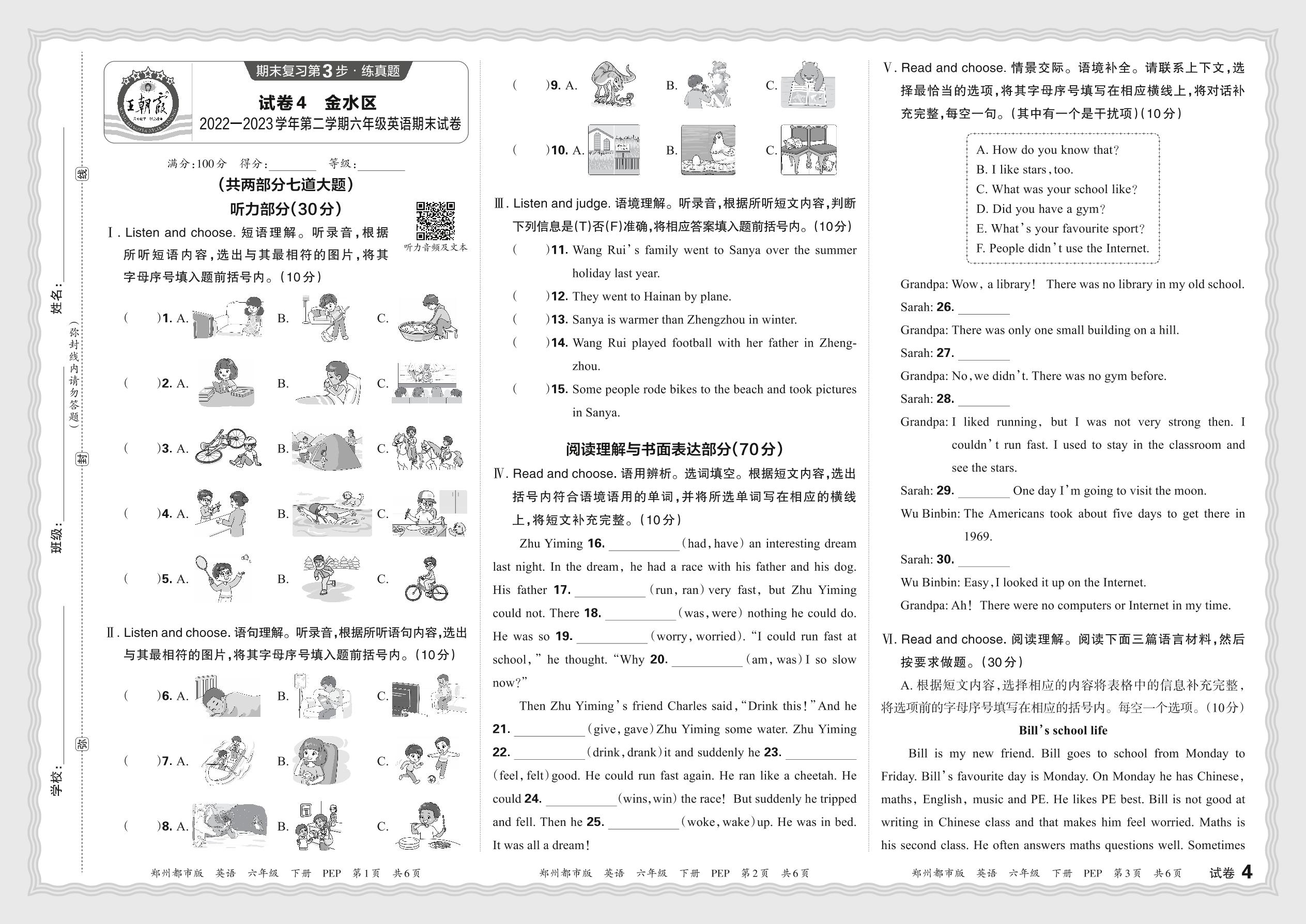 河南省郑州市金水区2022—2023学年下学期六年级英语期末试卷(人教PEP版)【4】
