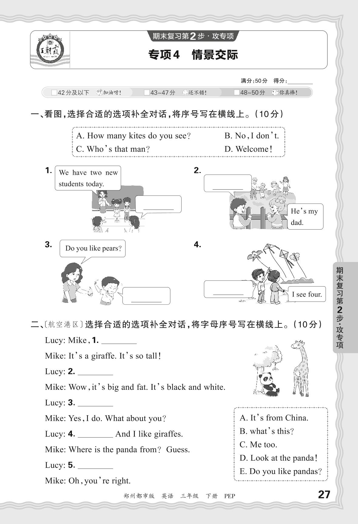 2024春下册三年级英语人教PEP版 期末专项卷郑州版·情景交际【4】