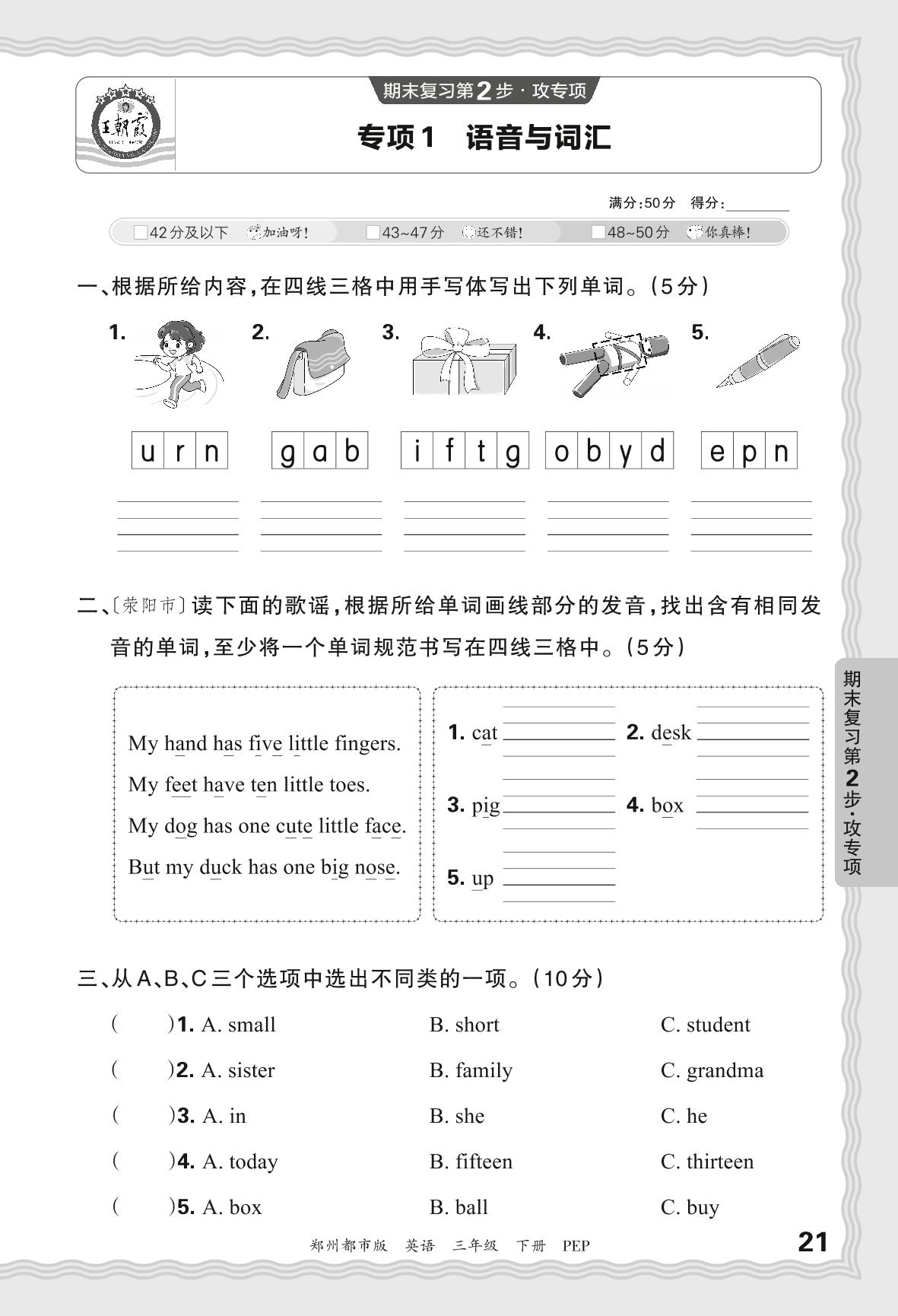 2024春下册三年级英语人教PEP版 期末专项卷郑州版·语音与词汇【1】