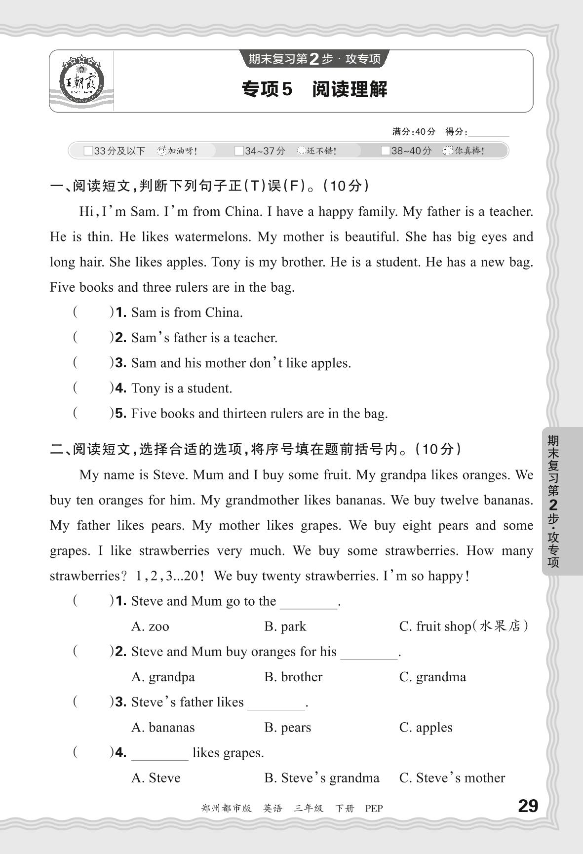 2024春下册三年级英语人教PEP版 期末专项卷郑州版·阅读理解【5】
