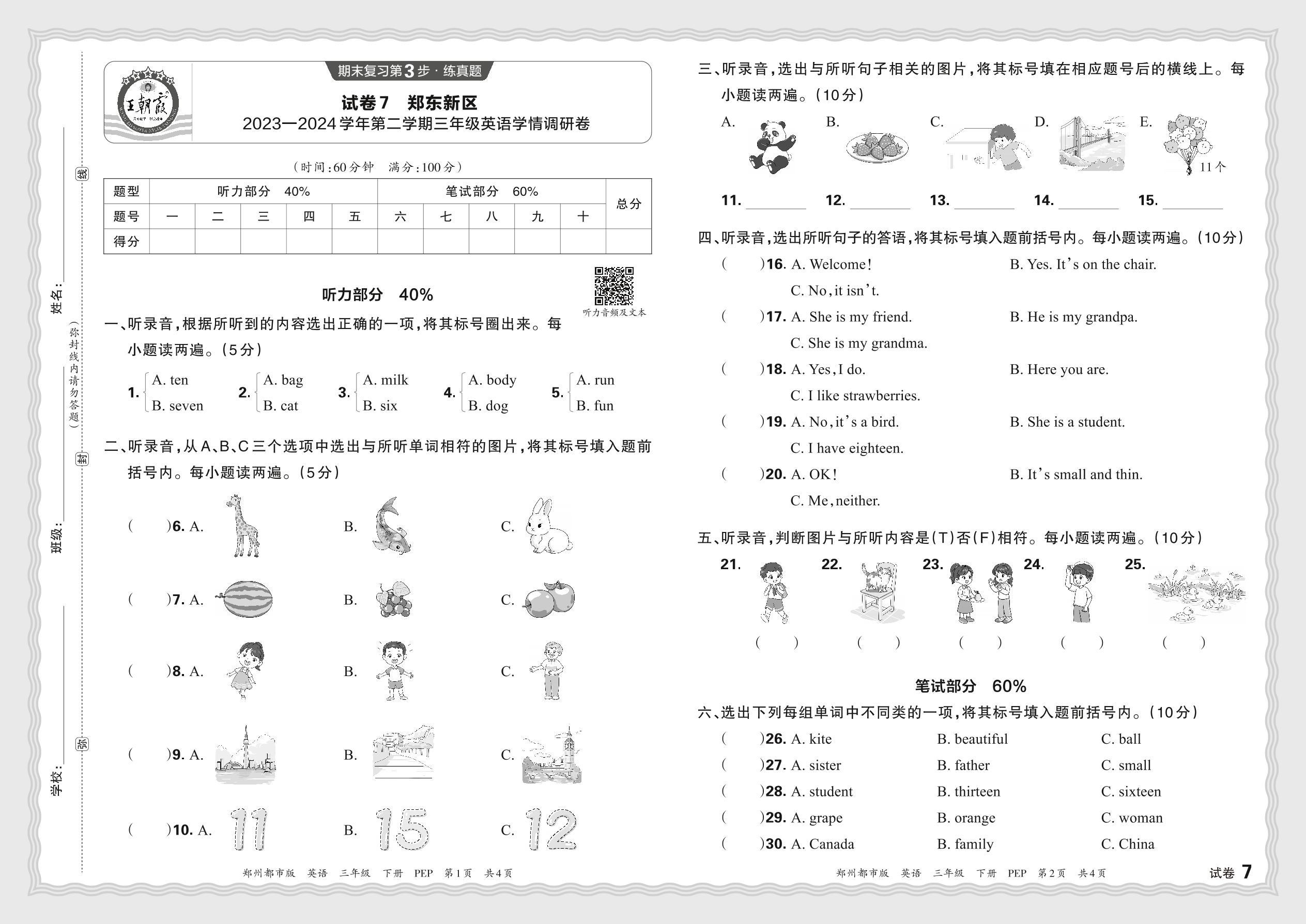 河南省郑州市郑东新区2023—2024学年第二学期三年级英语学情调研卷(人教PEP版)【7】