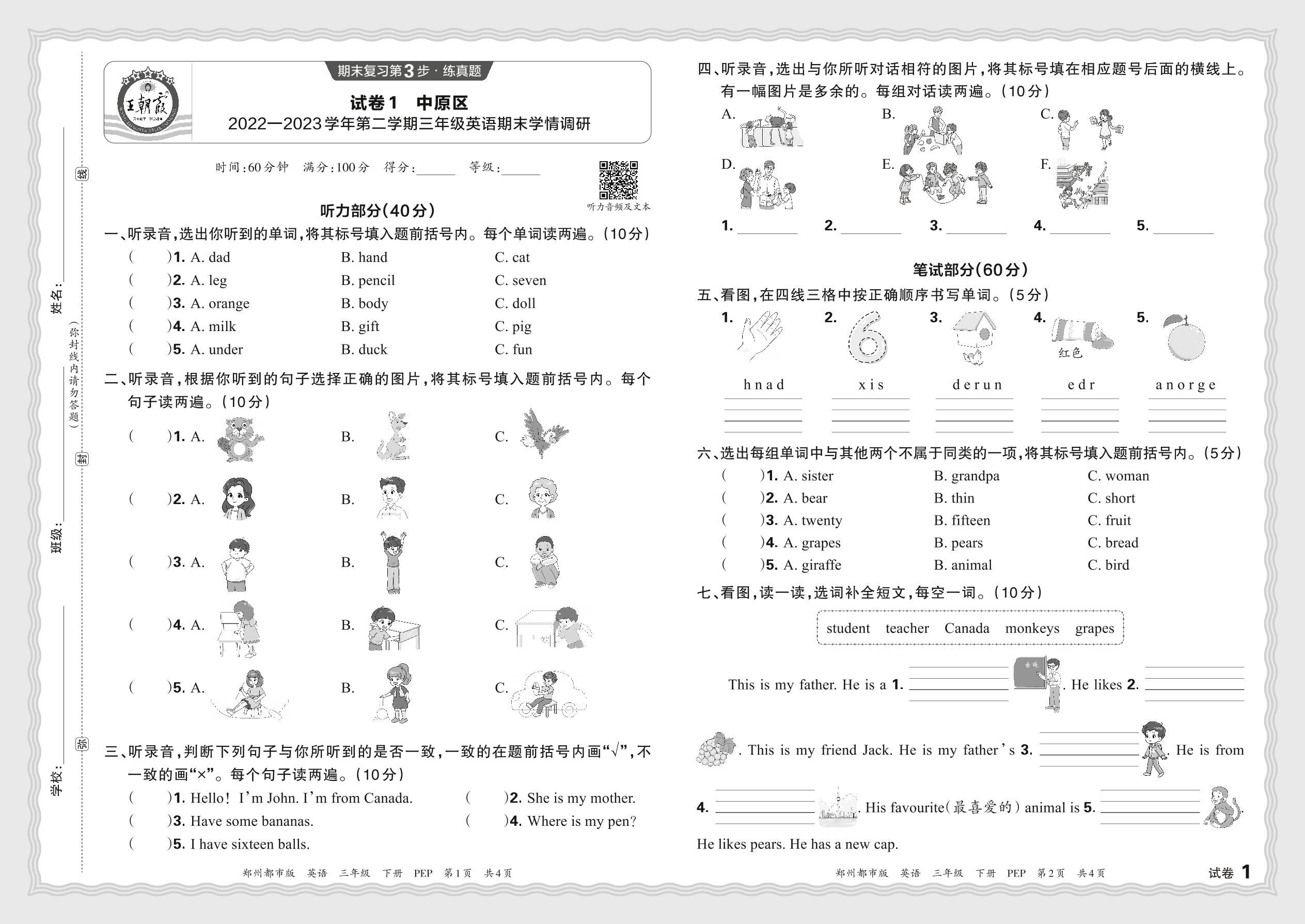 河南省郑州市中原区2022—2023学年第二学期三年级英语期末学情调研(人教PEP版)_R240423090223131【1】