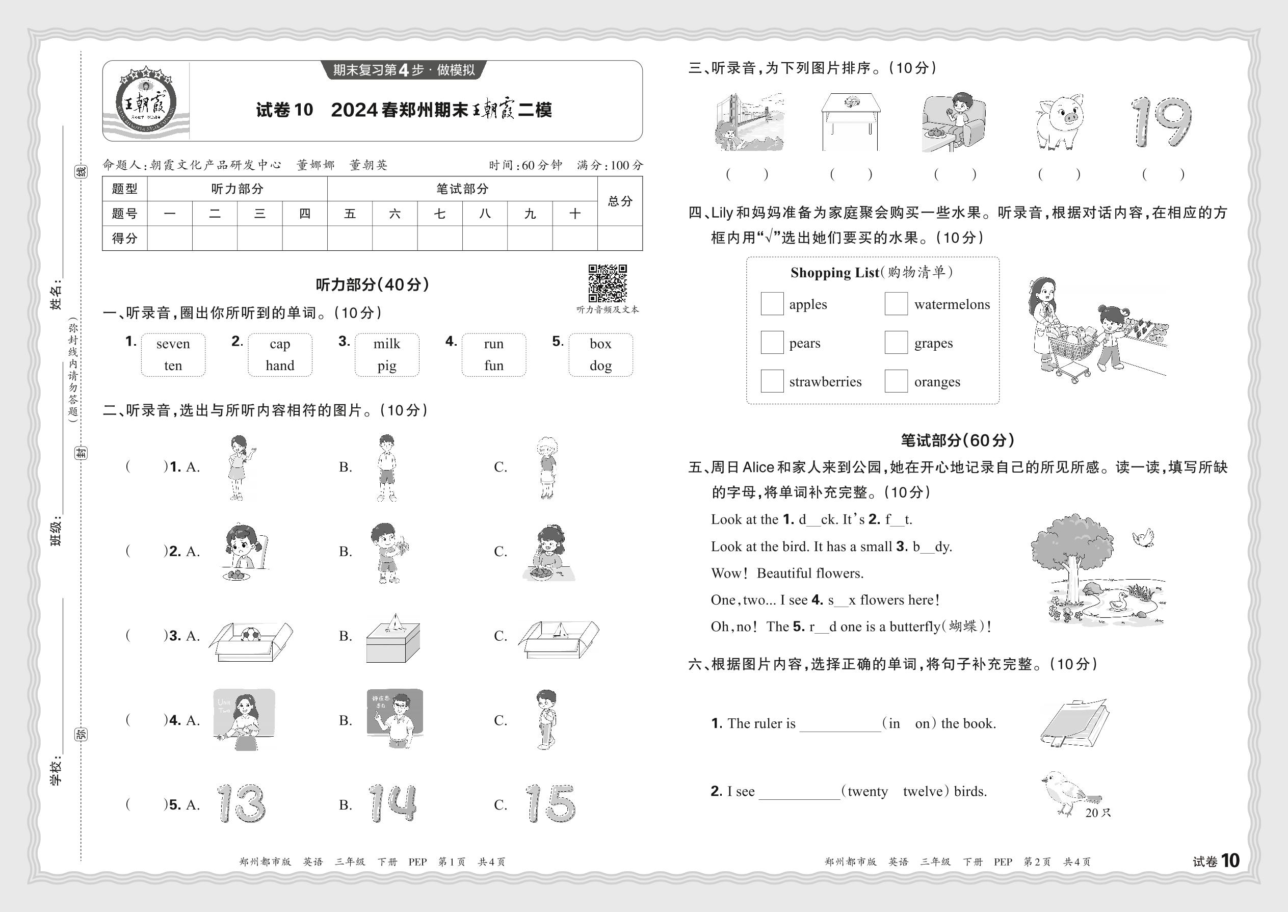 2024春下册三年级英语人教PEP版 河南郑州期末王朝霞二模