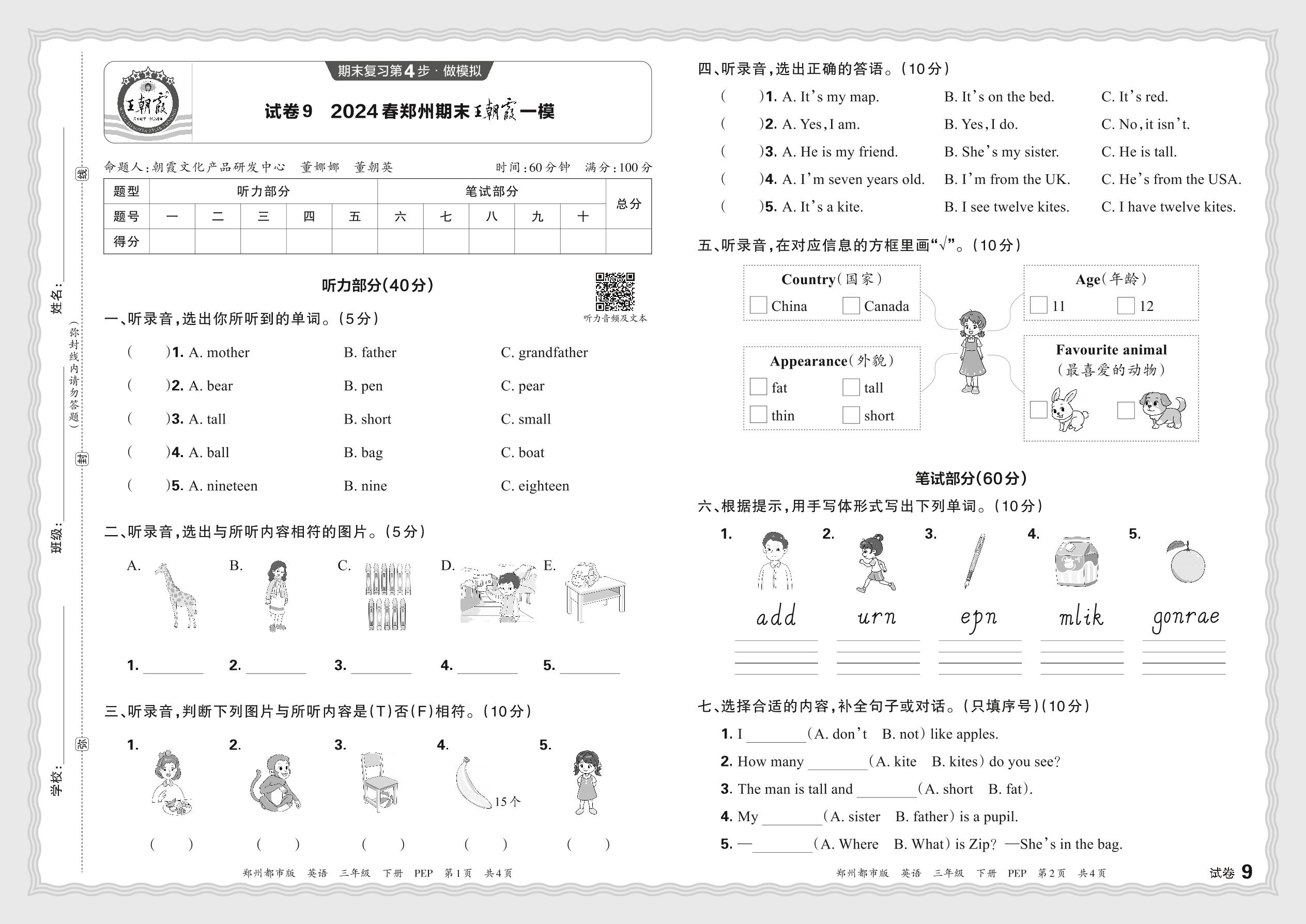 2024春下册三年级英语人教PEP版 河南郑州期末王朝霞一模