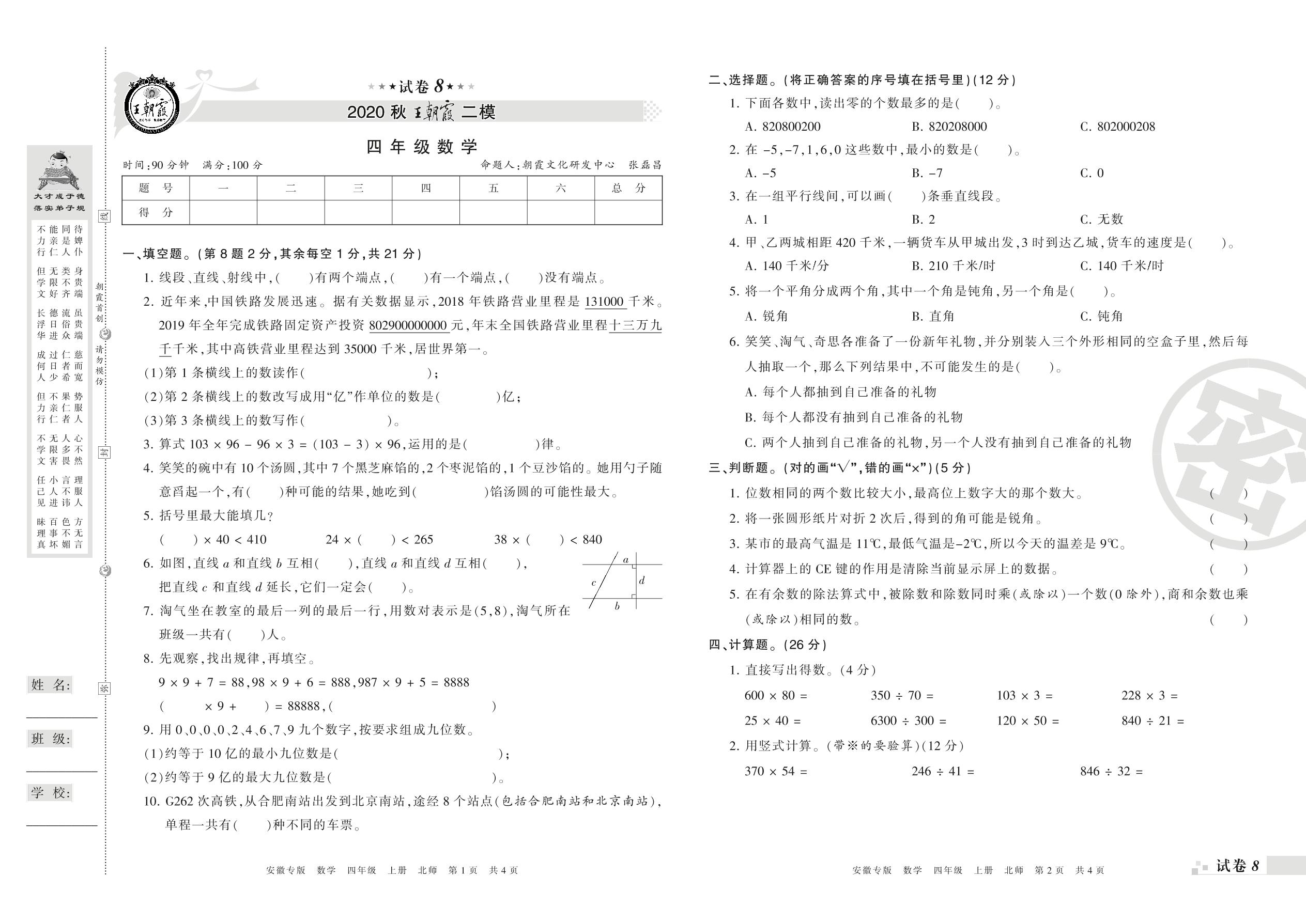 王朝霞期末模拟卷四年级上册数学(北师版)_R210804141614【8】