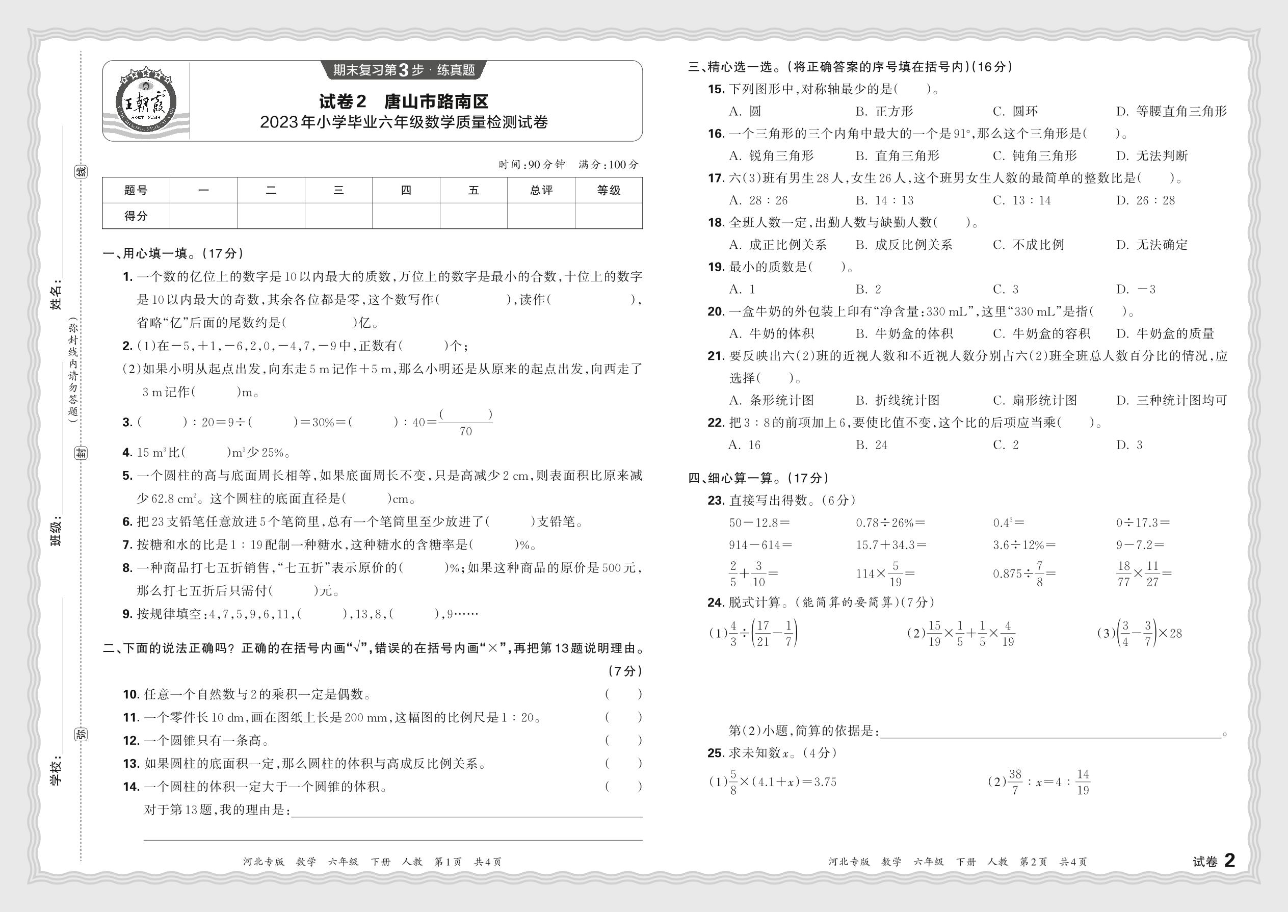 河北省唐山市路南区2023年小学毕业六年级数学质量检测试卷(人教版)【2】