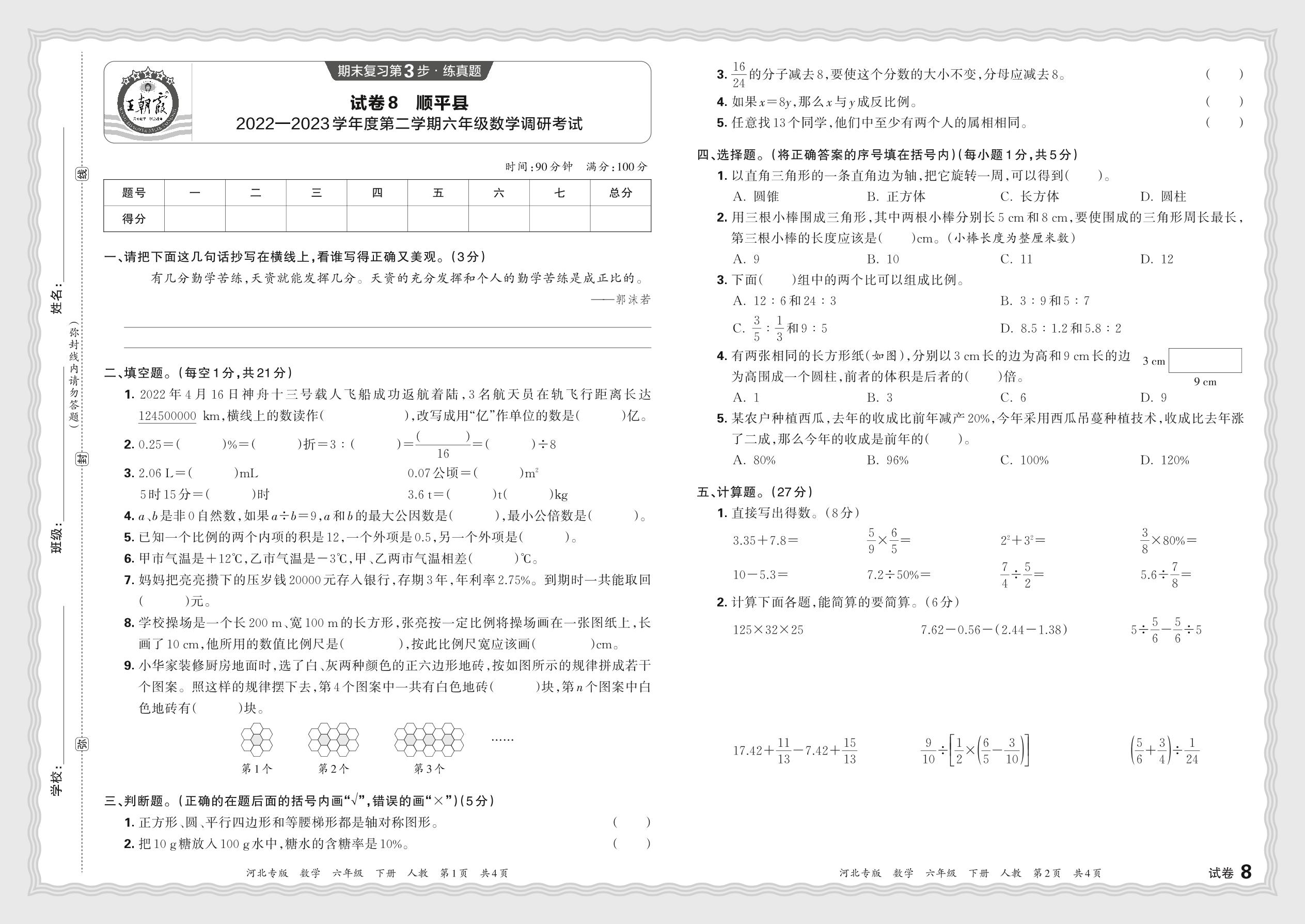 河北省保定市顺平县2022—2023学年度第二学期六年级数学调研试卷(人教版)【8】