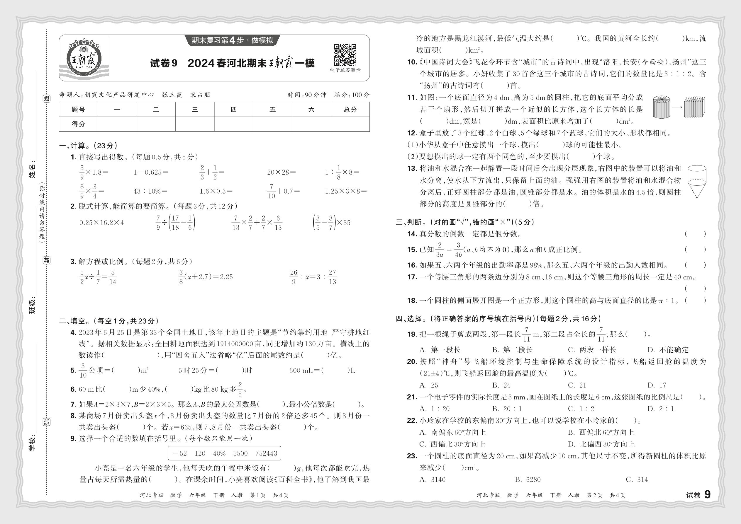 2024春下册六年级数学人教版 河北期末王朝霞一模