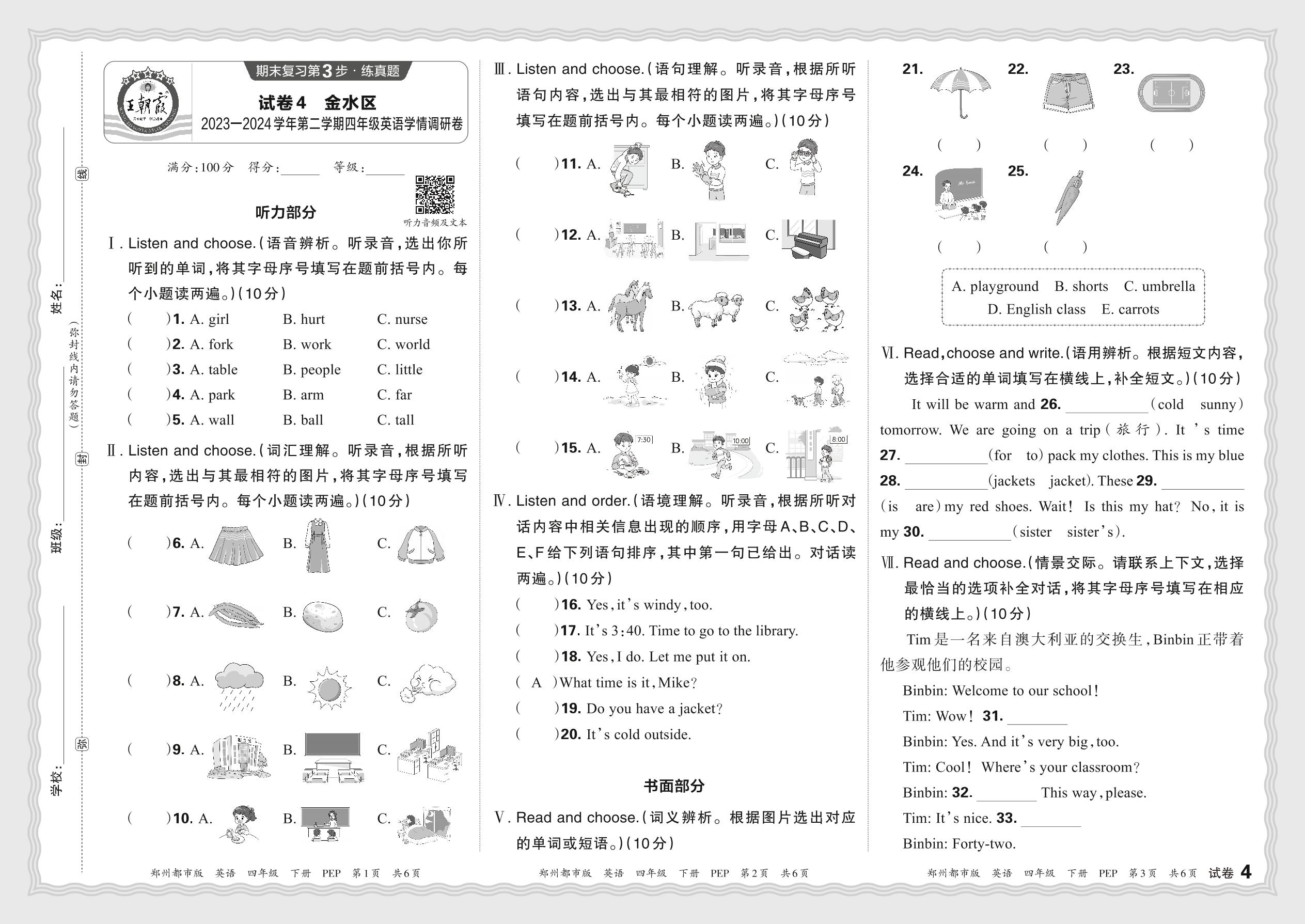 河南省郑州市金水区2022—2023学年下学期四年级英语学情调研卷(人教PEP版)【4】