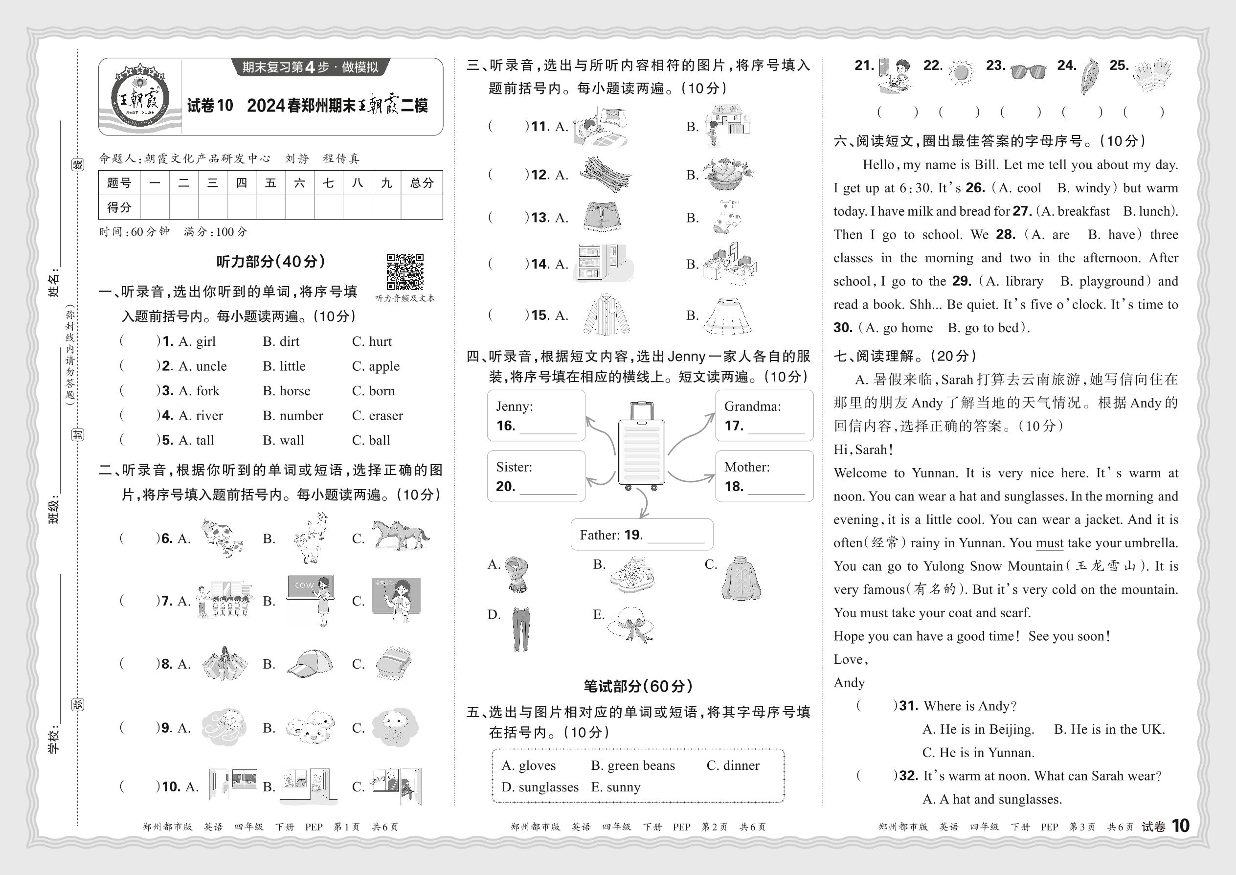 2024春下册四年级英语人教PEP版 河南郑州期末王朝霞二模