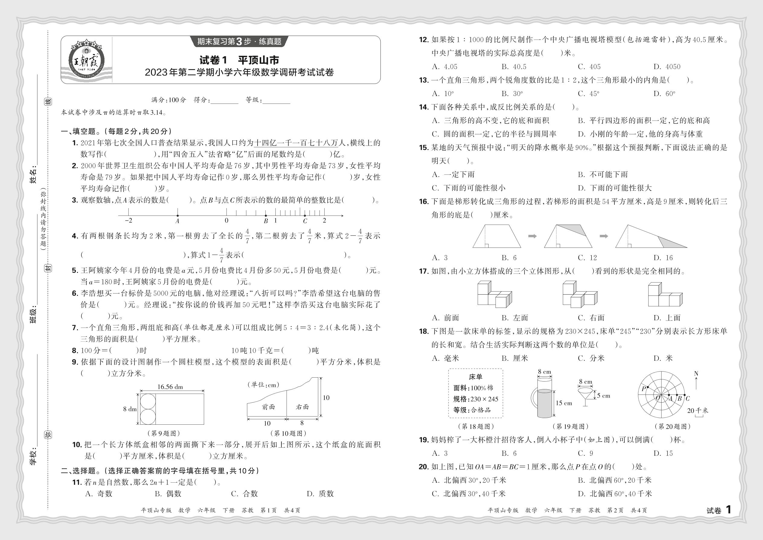 河南省平顶山市2023年第二学期小学六年级数学调研考试试卷(苏教版)_R240423091342544【1】