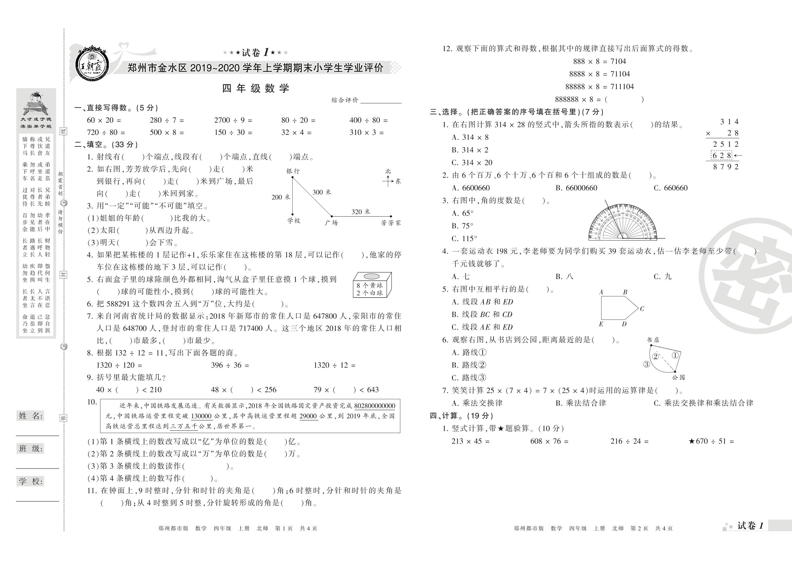 2019-2020学年第一学期郑州市金水区四年级数学试卷(北师版)_R210804141637【1】