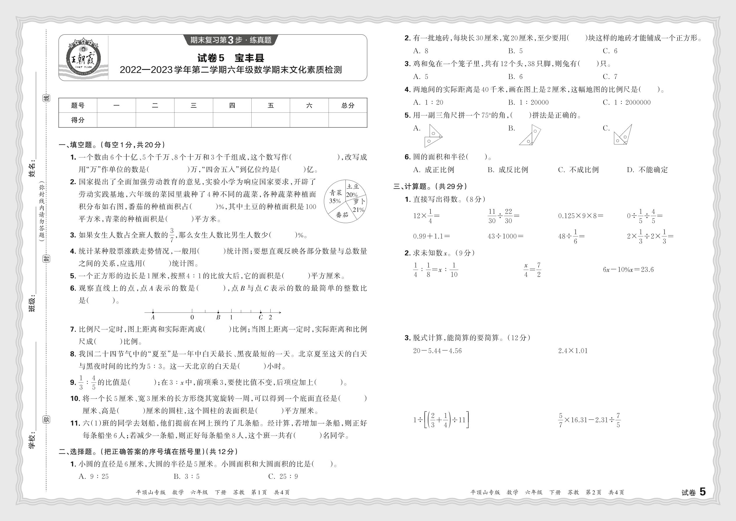 河南省平顶山市宝丰县2022-2023学年第二学期六年级数学期末文化素质检测(苏教版)【5】
