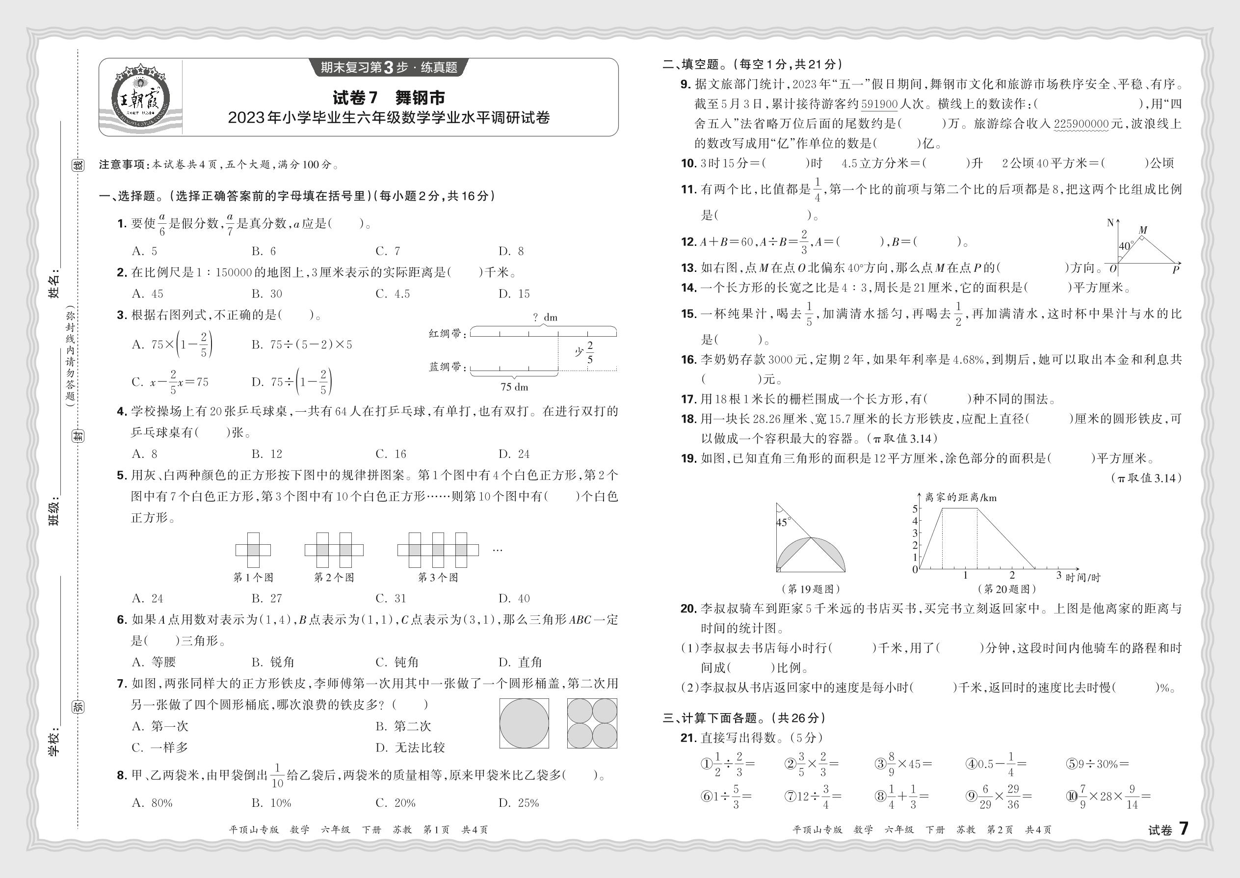 河南省平顶山市舞钢市2023年小学毕业生六年级数学学业水平调研试卷(苏教版)【7】