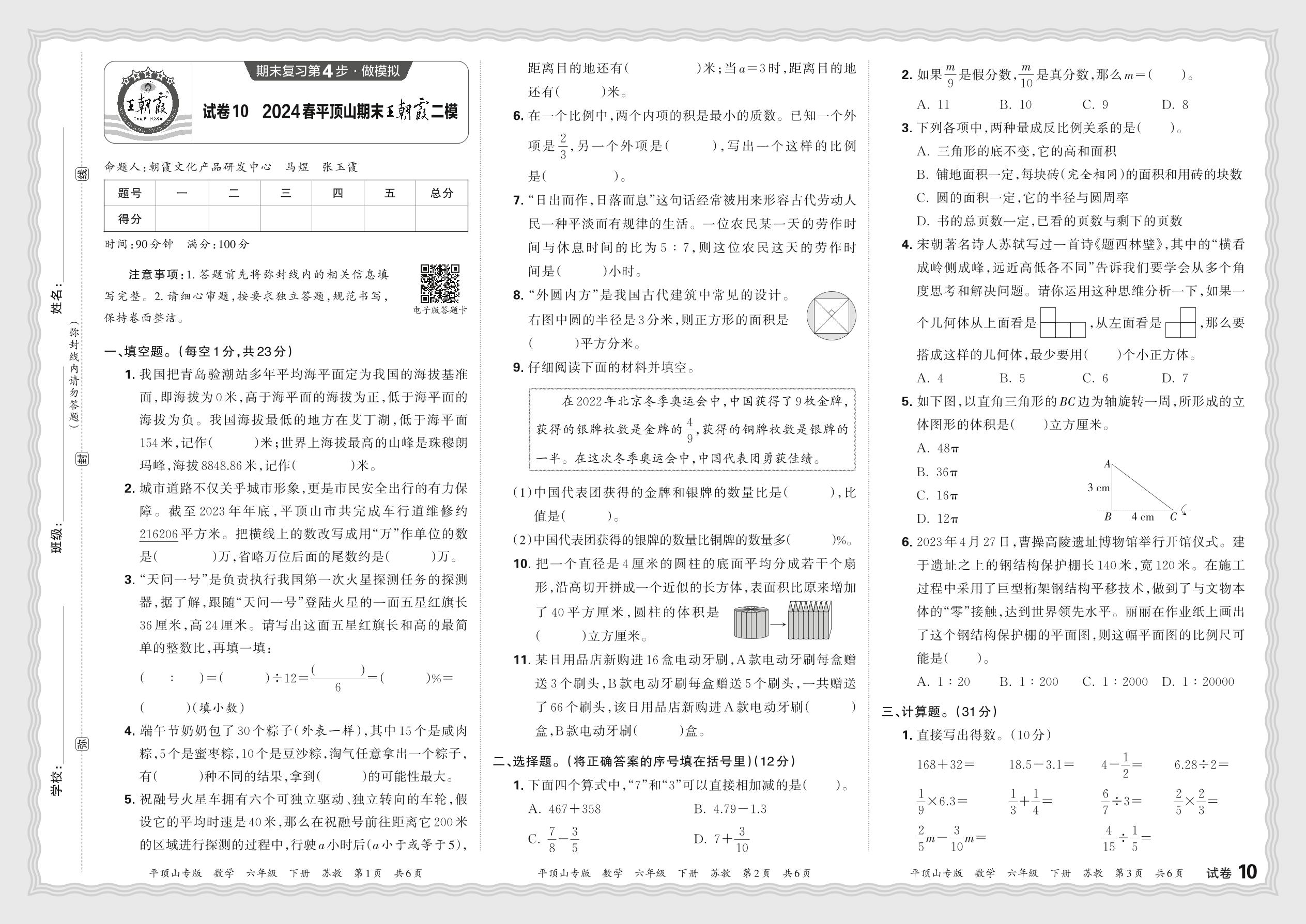 2024春下册六年级数学苏教版 河南平顶山期末王朝霞二模【10】