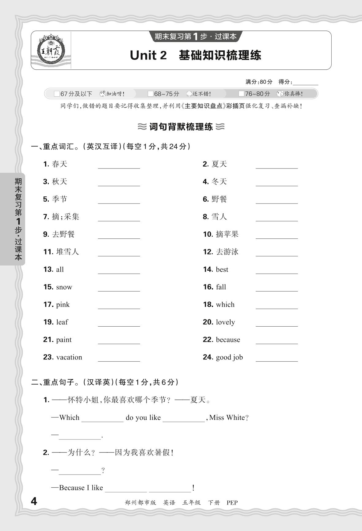2024春下册五年级英语人教PEP版 期末过课本郑州版·Unit 2 基础知识梳理练