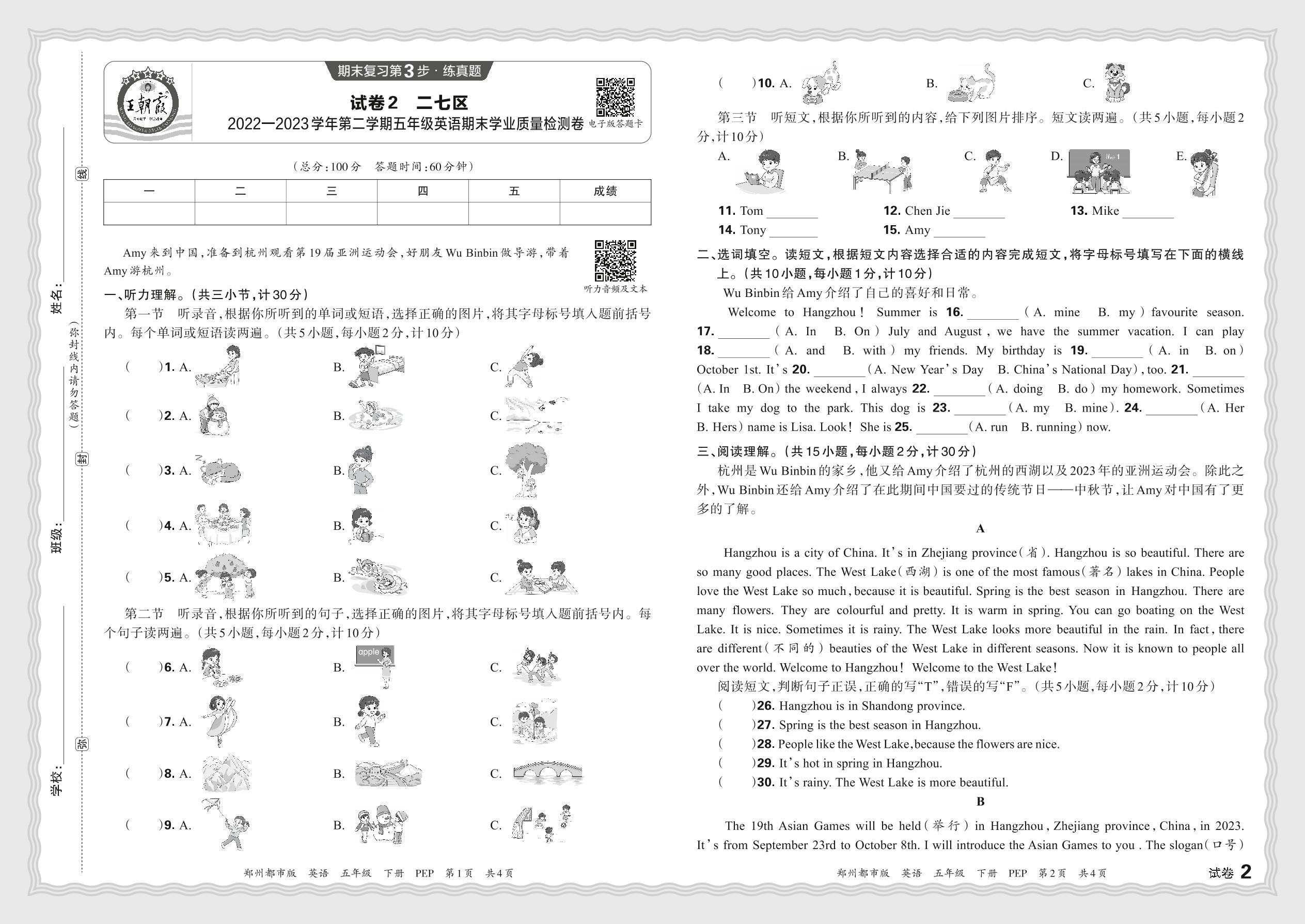 河南省郑州市二七区2022—2023学年第二学期五年级英语期末学业质量检测卷(人教PEP版)【2】