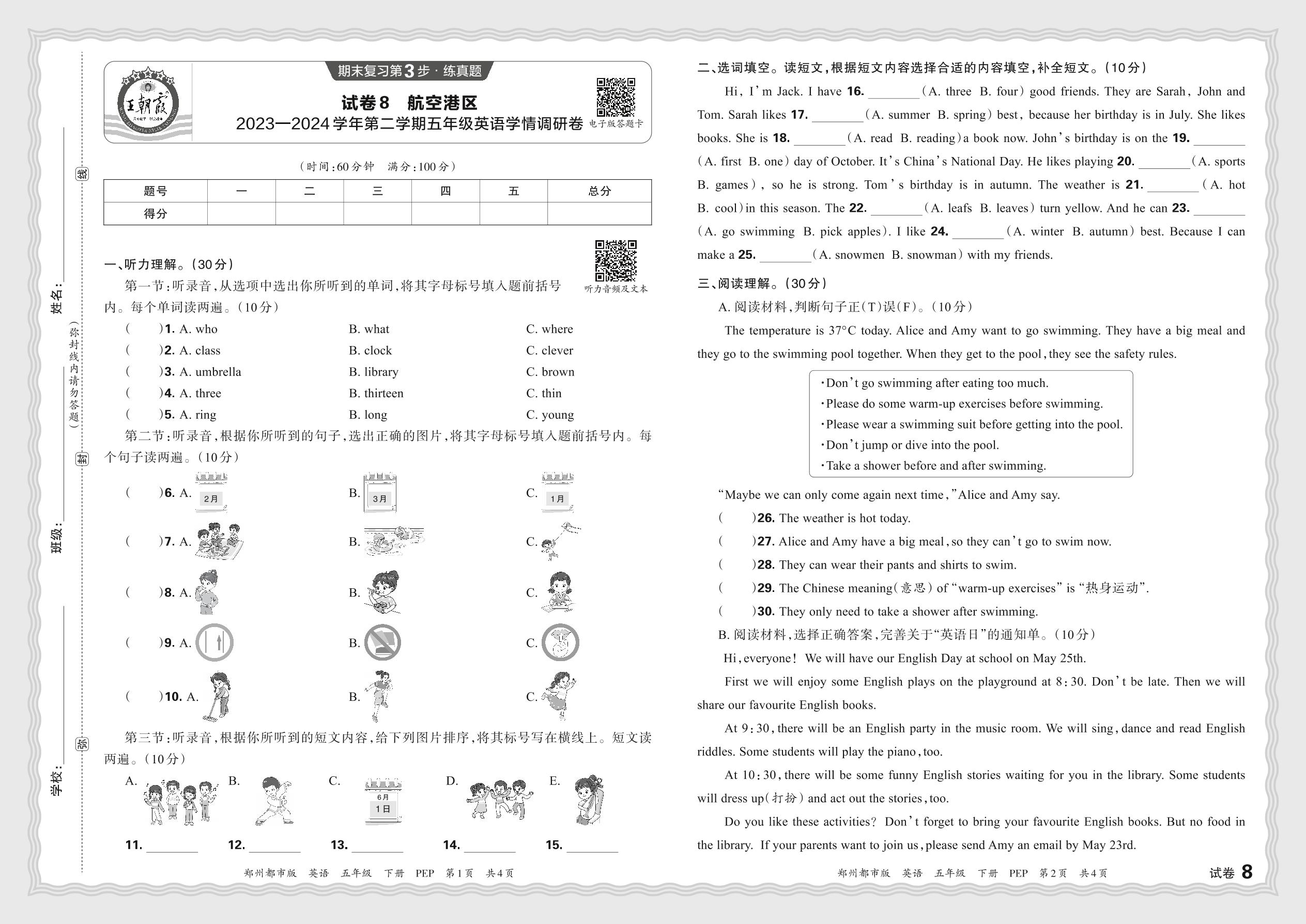 河南省郑州市航空港区2023—2024学年第二学期五年级英语学情调研卷(人教PEP版)【8】