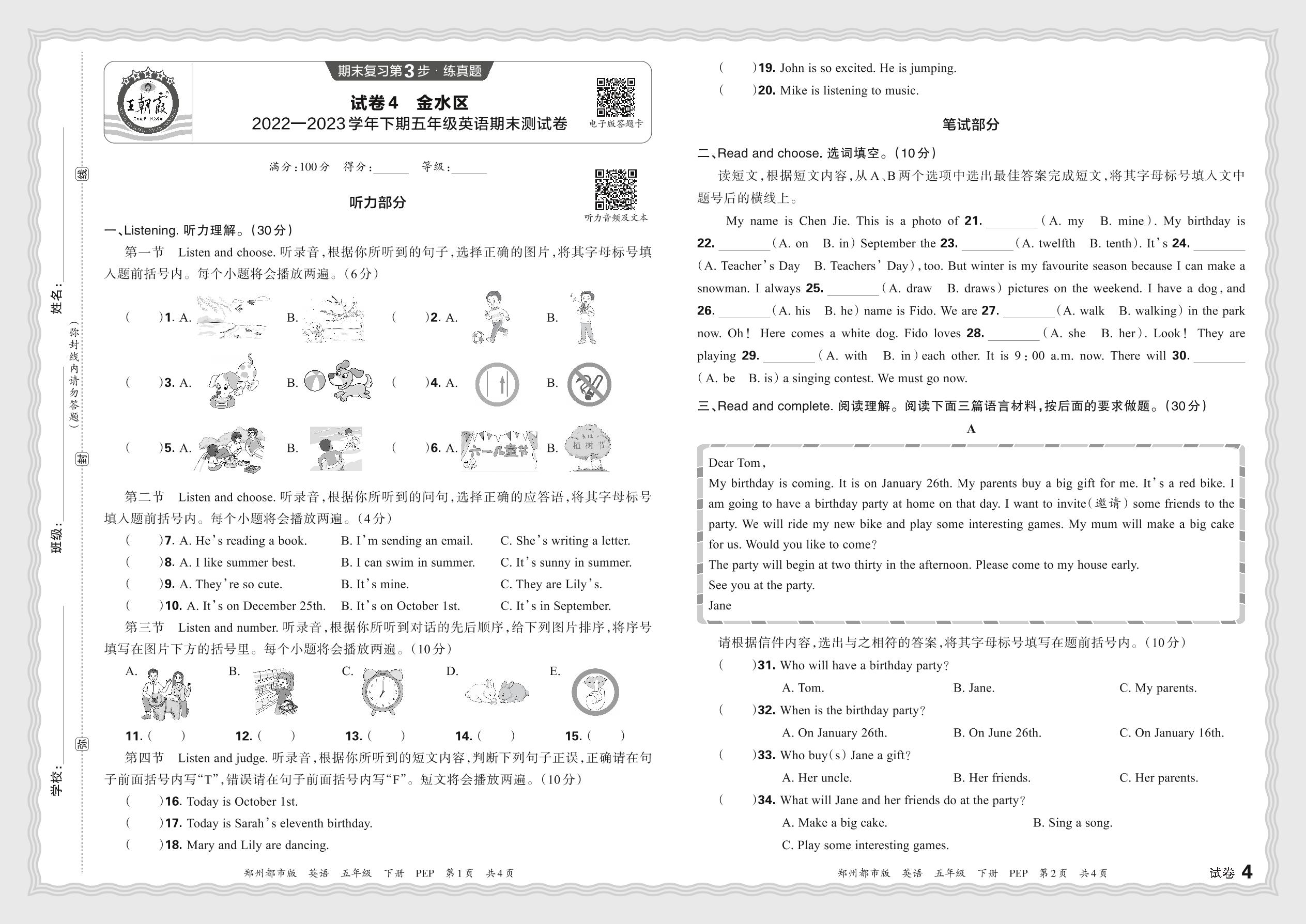 河南省郑州市金水区2022—2023学年下期五年级英语期末测试卷(人教PEP版)【4】