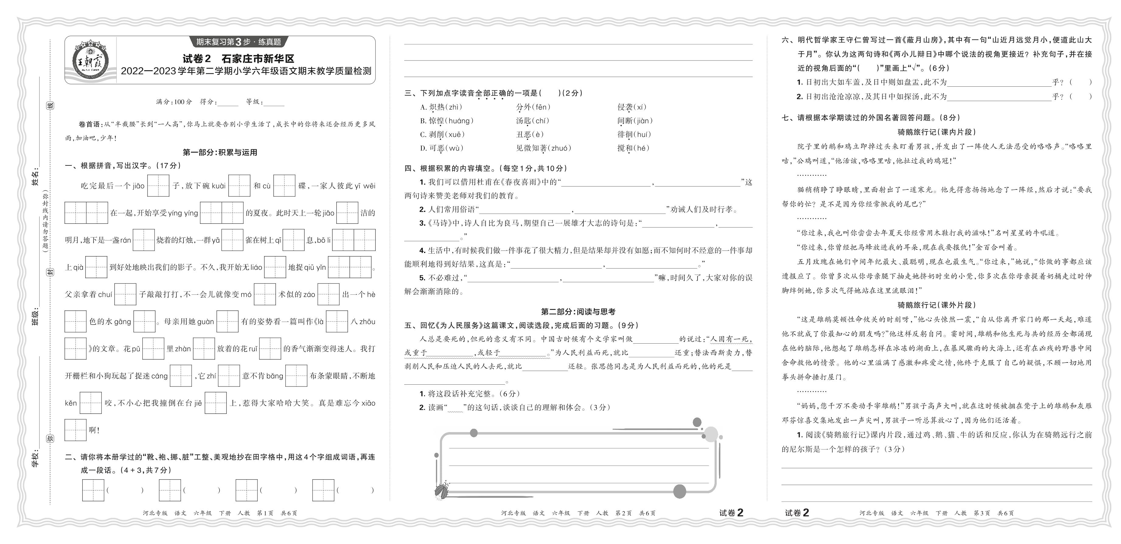 河北省石家庄市新华区2022—2023学年第二学期小学六年级语文期末教学质量检测(人教版)【2】
