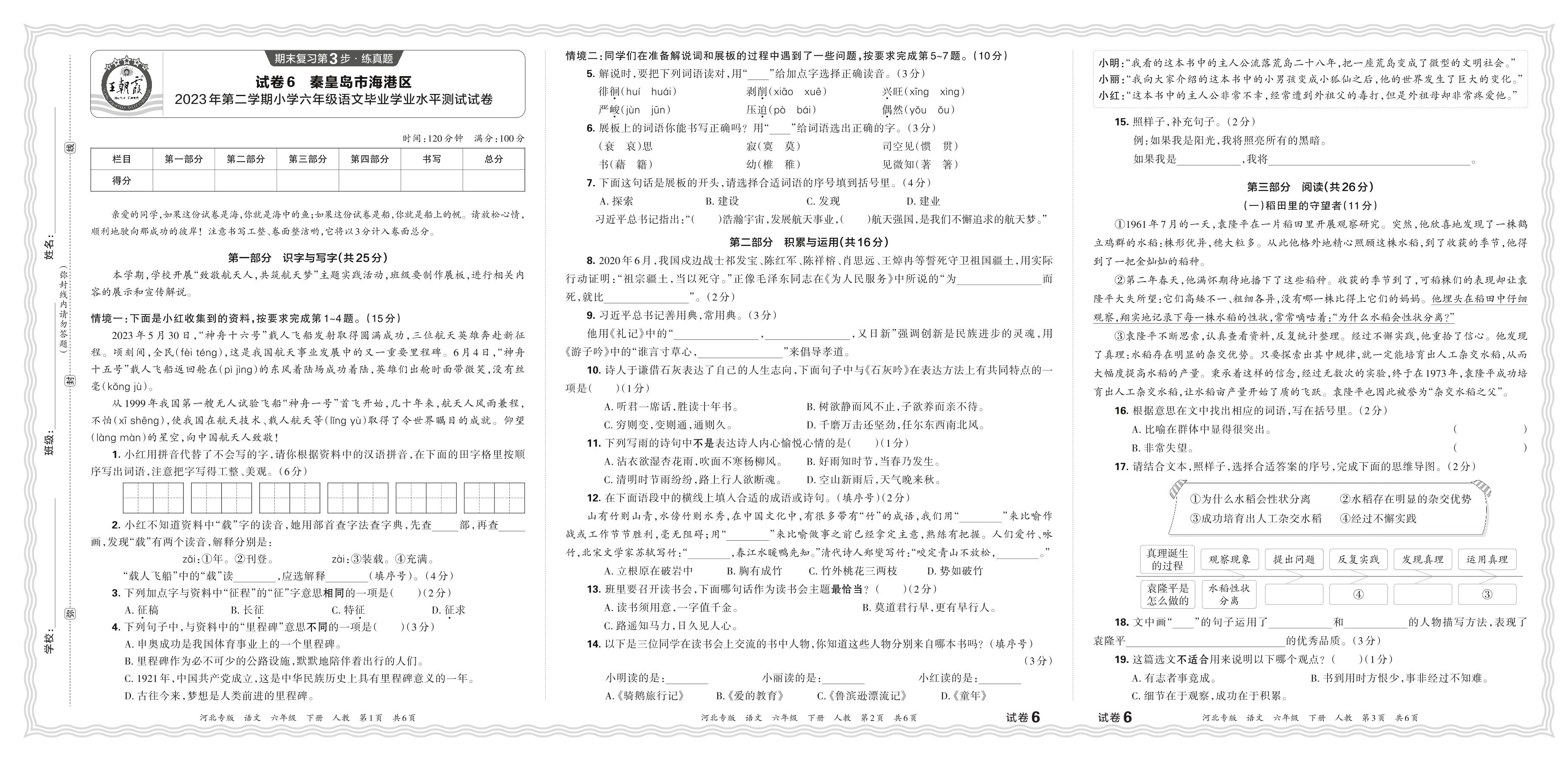 河北省秦皇岛市海港区2023年第二学期小学六年级语文毕业学业水平测试试卷(人教版)【6】