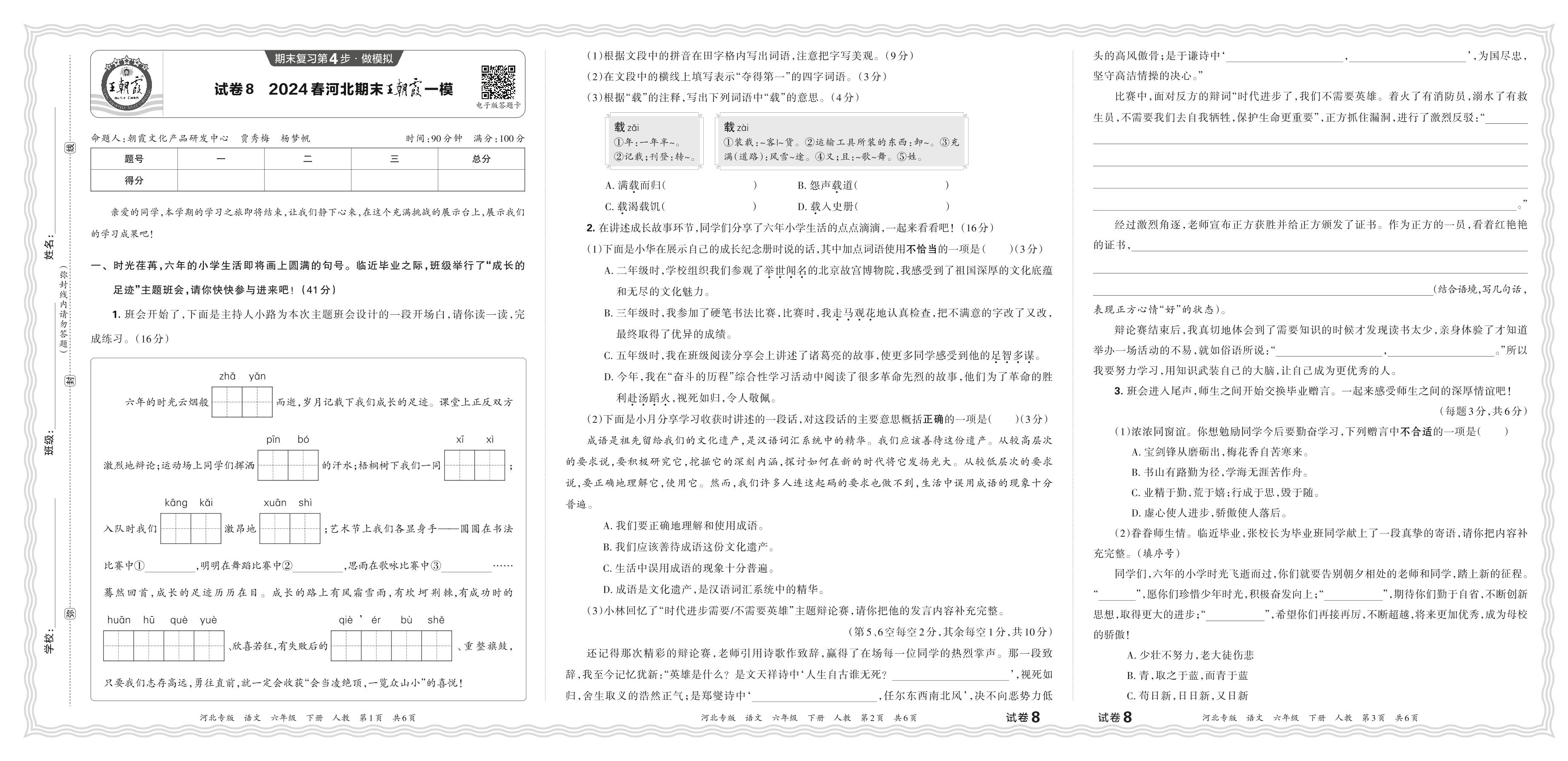2024春下册六年级语文人教版 河北期末王朝霞一模