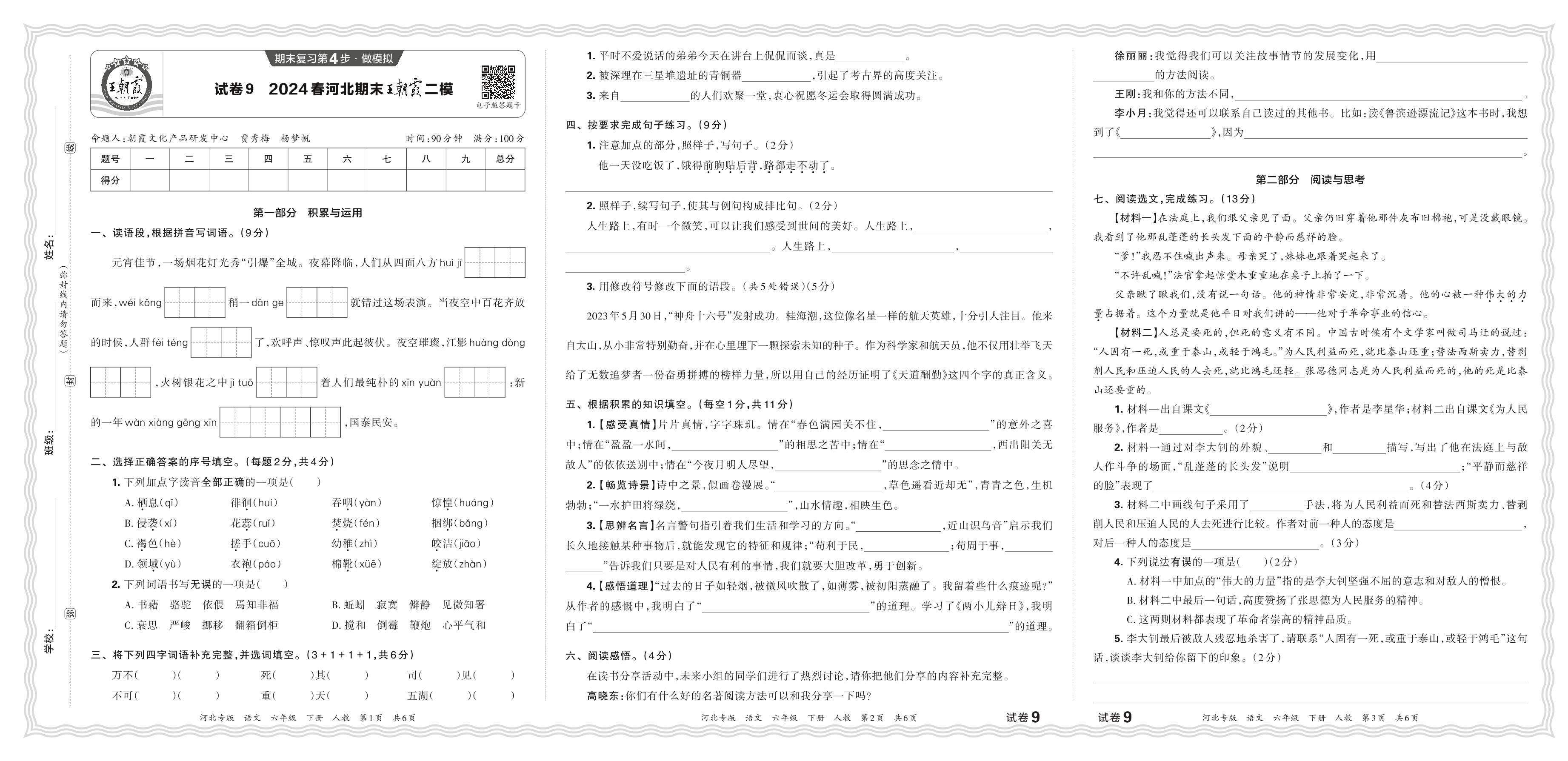 2024春下册六年级语文人教版 河北期末王朝霞二模