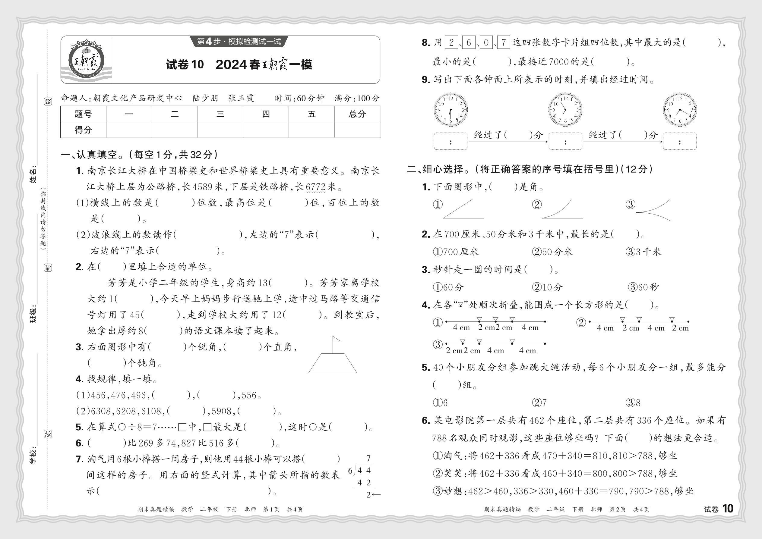 2024春下册二年级数学北师版 河南郑州期末王朝霞一模