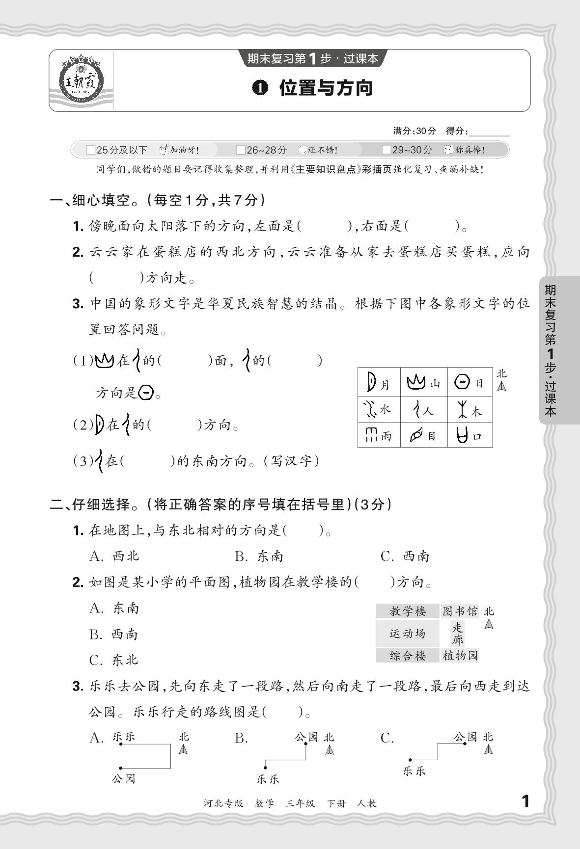 2024春下册三年级数学人教版 期末过课本河北版·位置与方向【1】