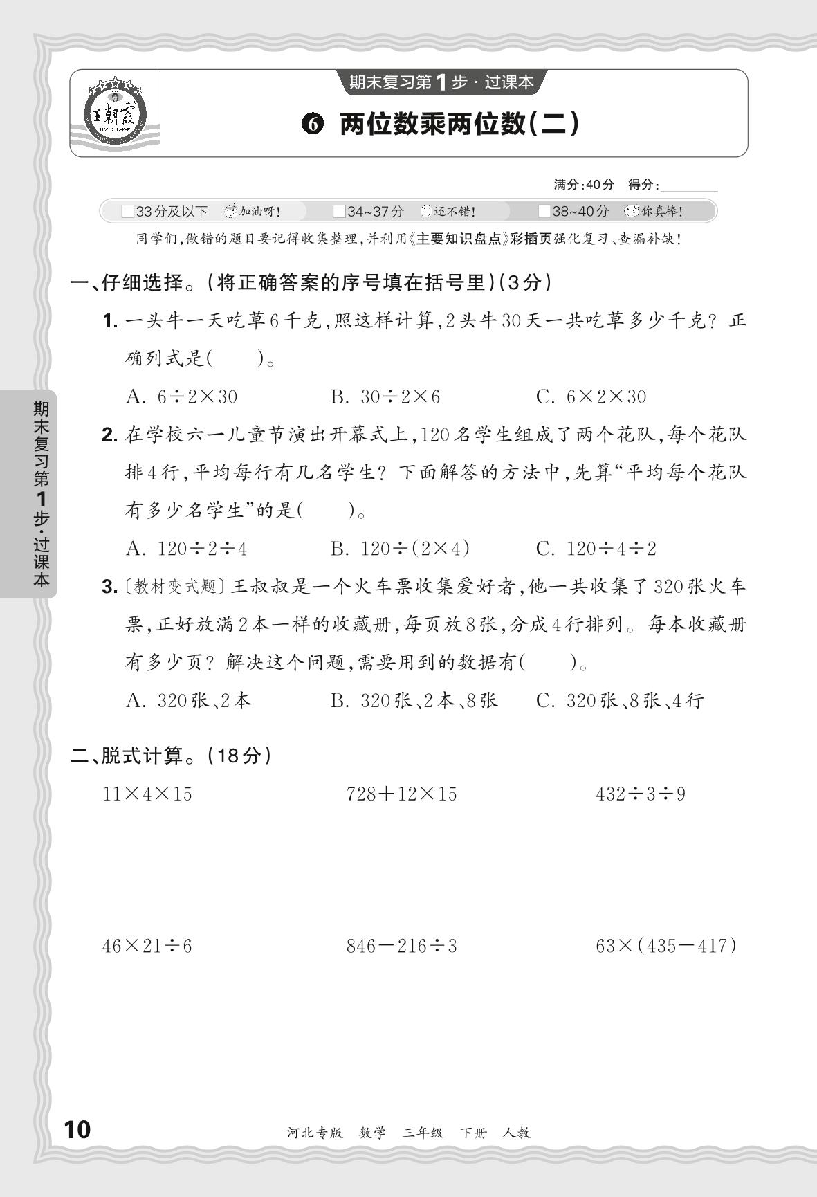 2024春下册三年级数学人教版 期末过课本河北版·两位数乘两位数(二)【6】