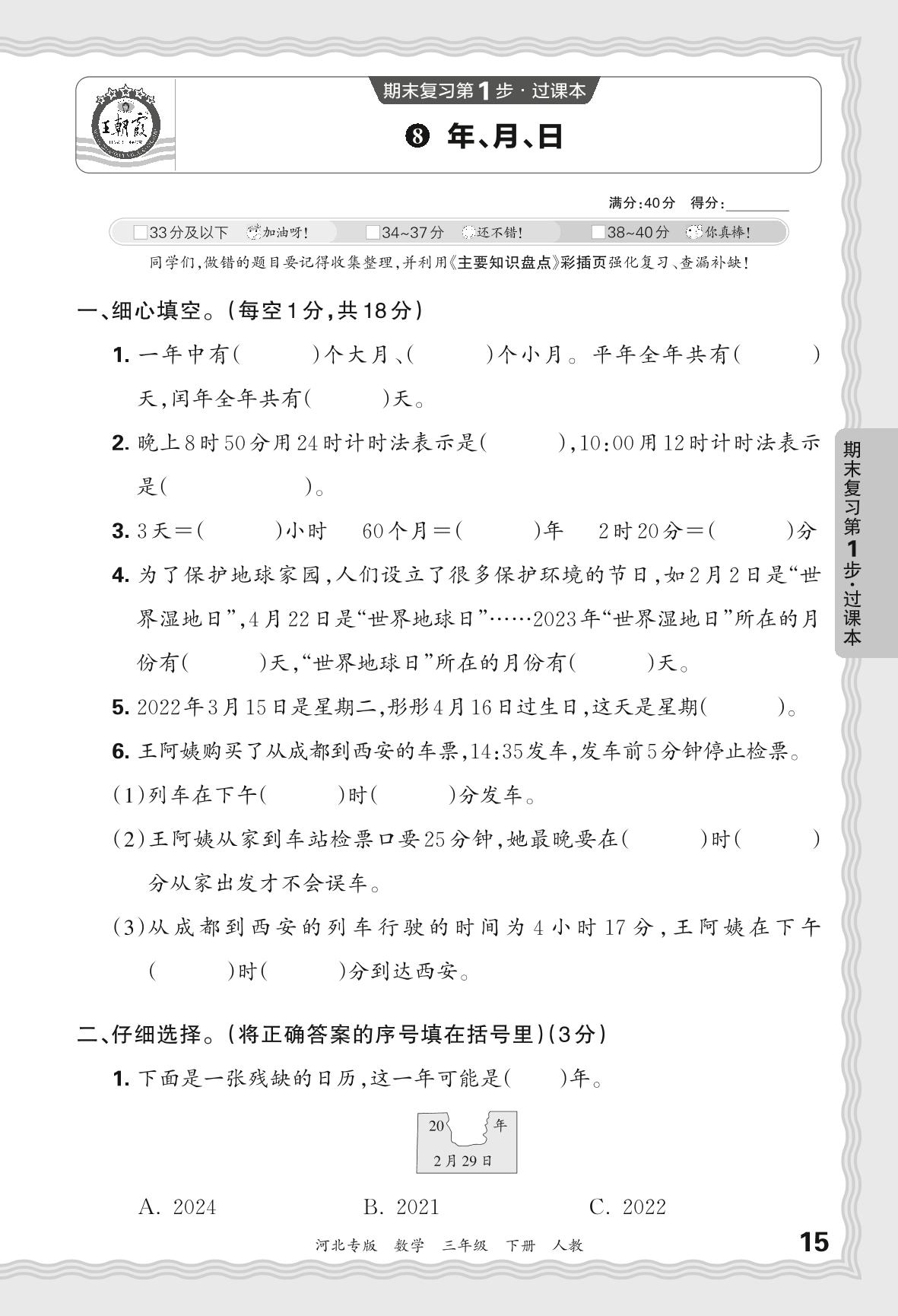 2024春下册三年级数学人教版 期末过课本河北版·年、月、日【8】