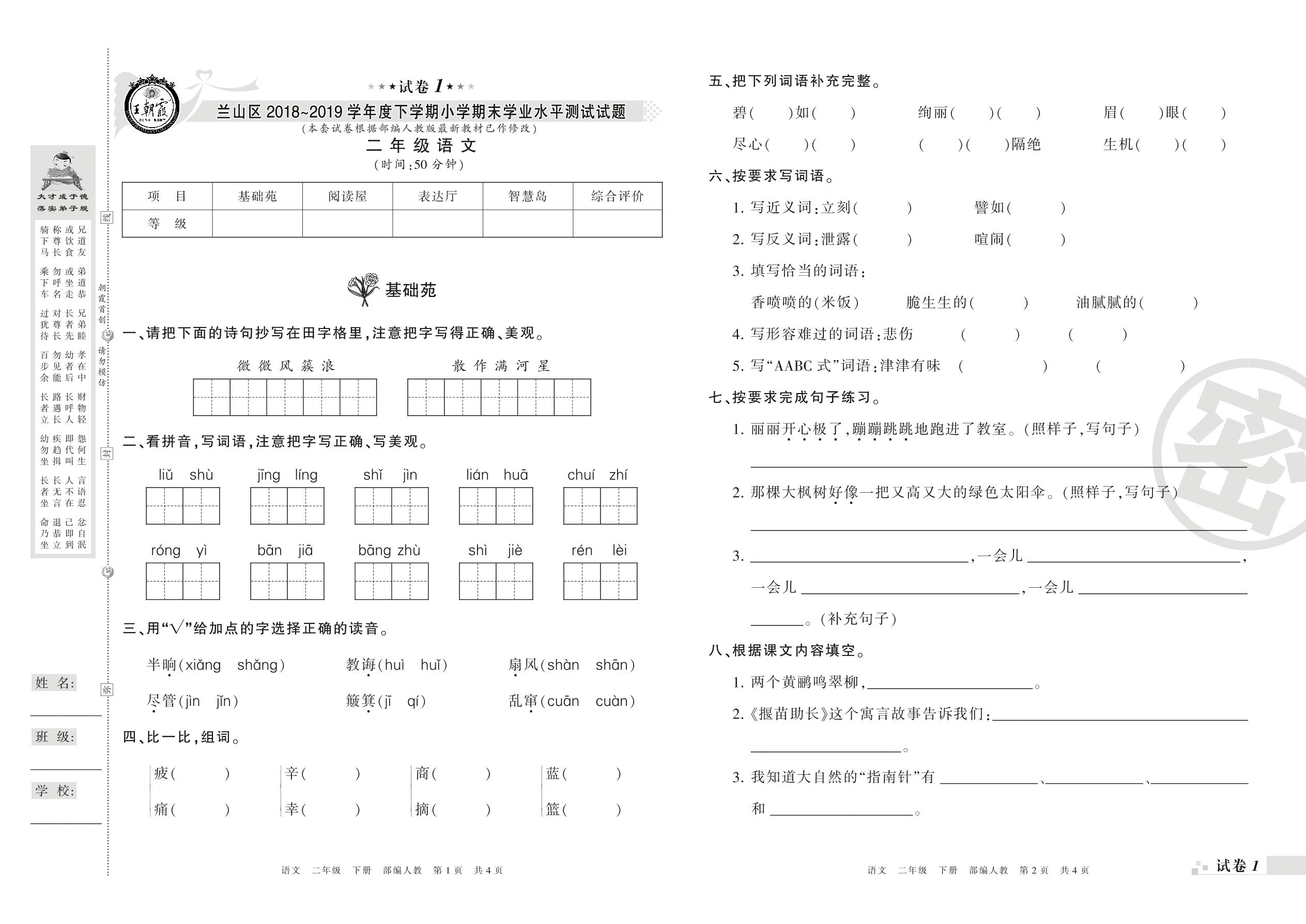 2018-2019学年第二学期临沂市兰山区二年级语文试卷(人教版)【1】