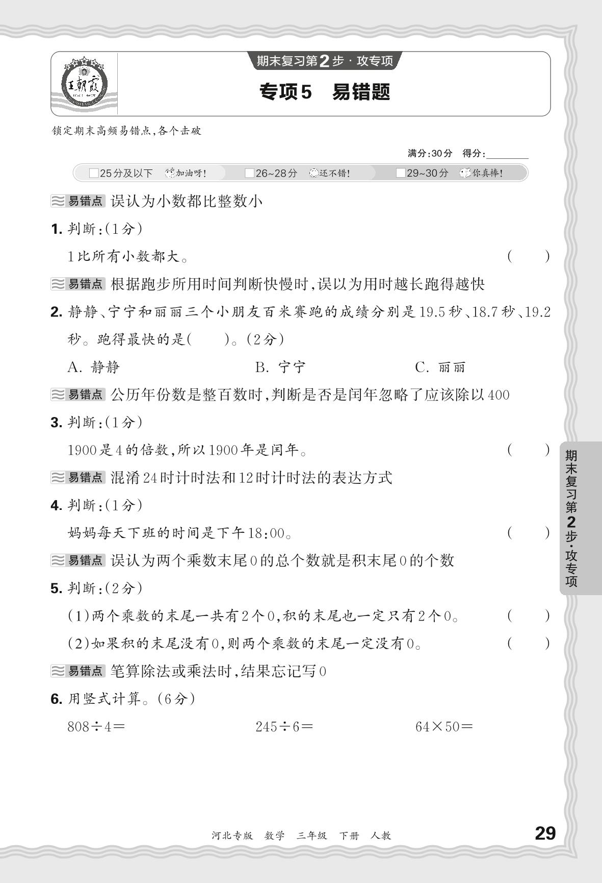 2024春下册三年级数学人教版 期末专项卷河北版·易错题【5】