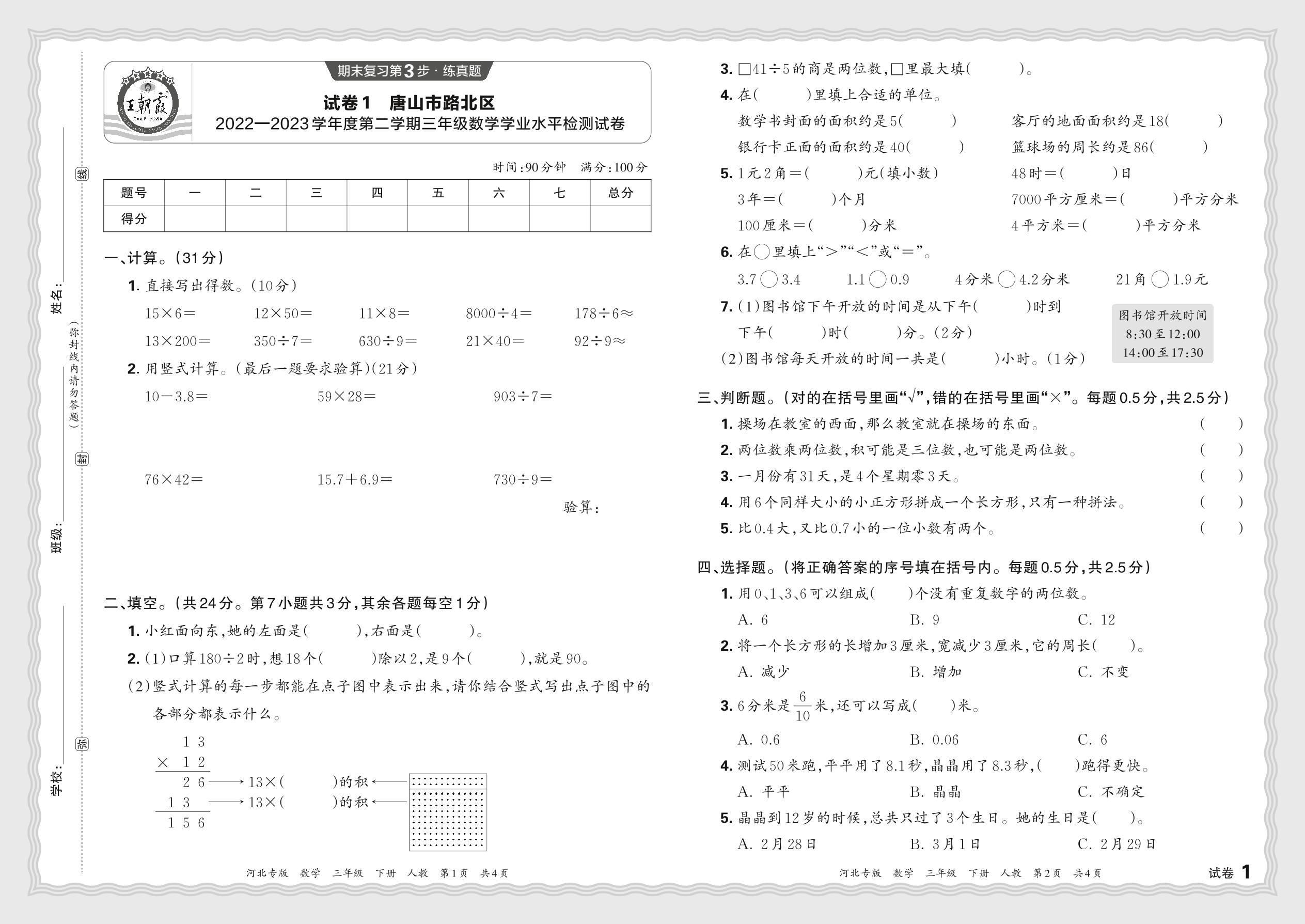 河北省唐山市路北区2022—2023学年度第二学期三年级数学学业水平检测试卷(人教版)【1】