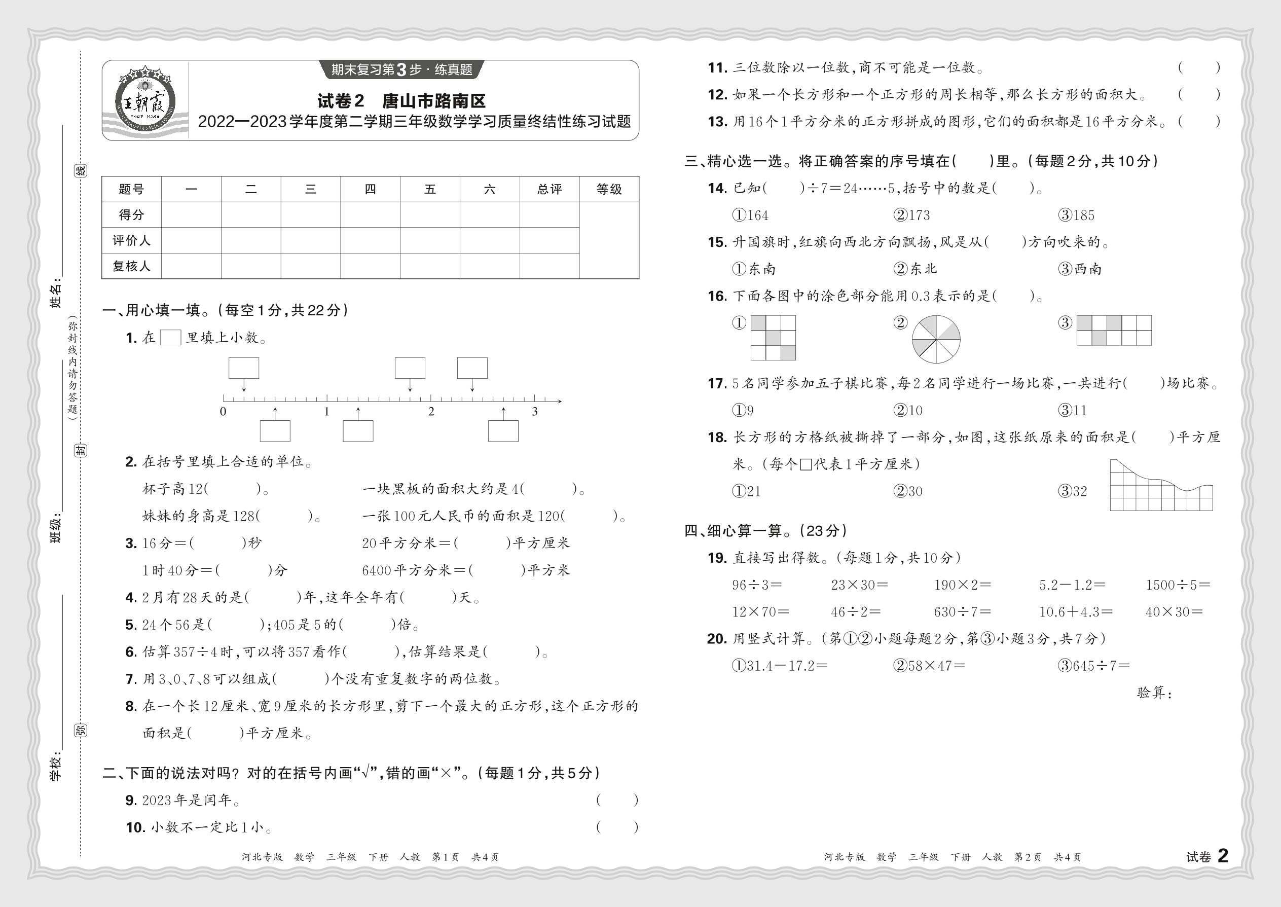 河北省唐山市路南区2022—2023学年度第二学期三年级数学学习质量终结性练习试题(人教版)【2】