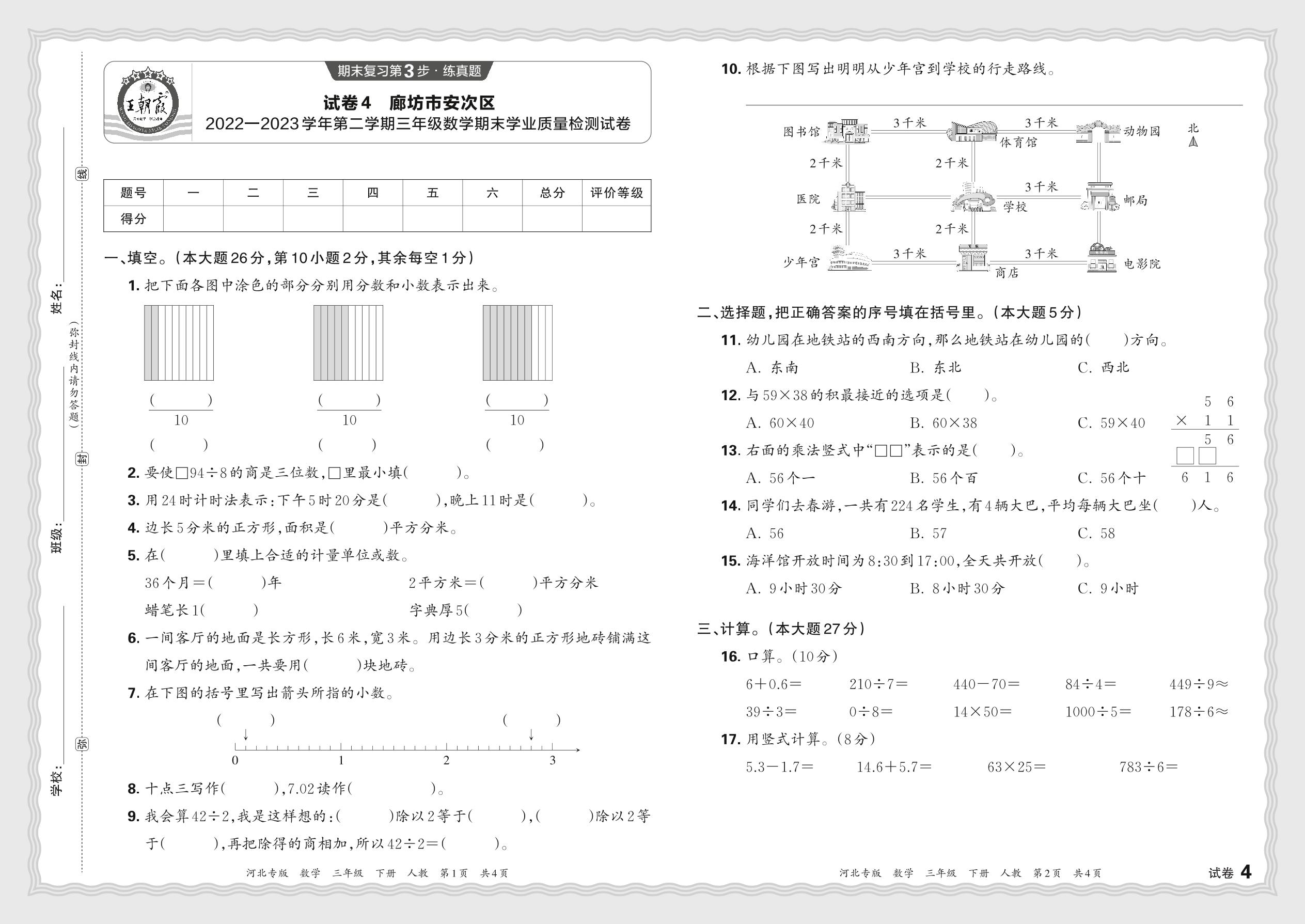 河北省廊坊市安次区2022—2023学年第二学期三年级数学期末学业质量检测试卷(人教版)【4】