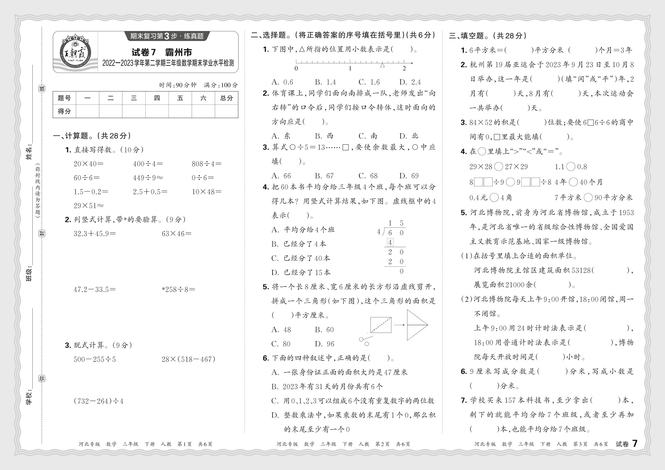 河北省廊坊市霸州市2022—2023学年第二学期三年级数学期末学业水平检测(人教版)【7】