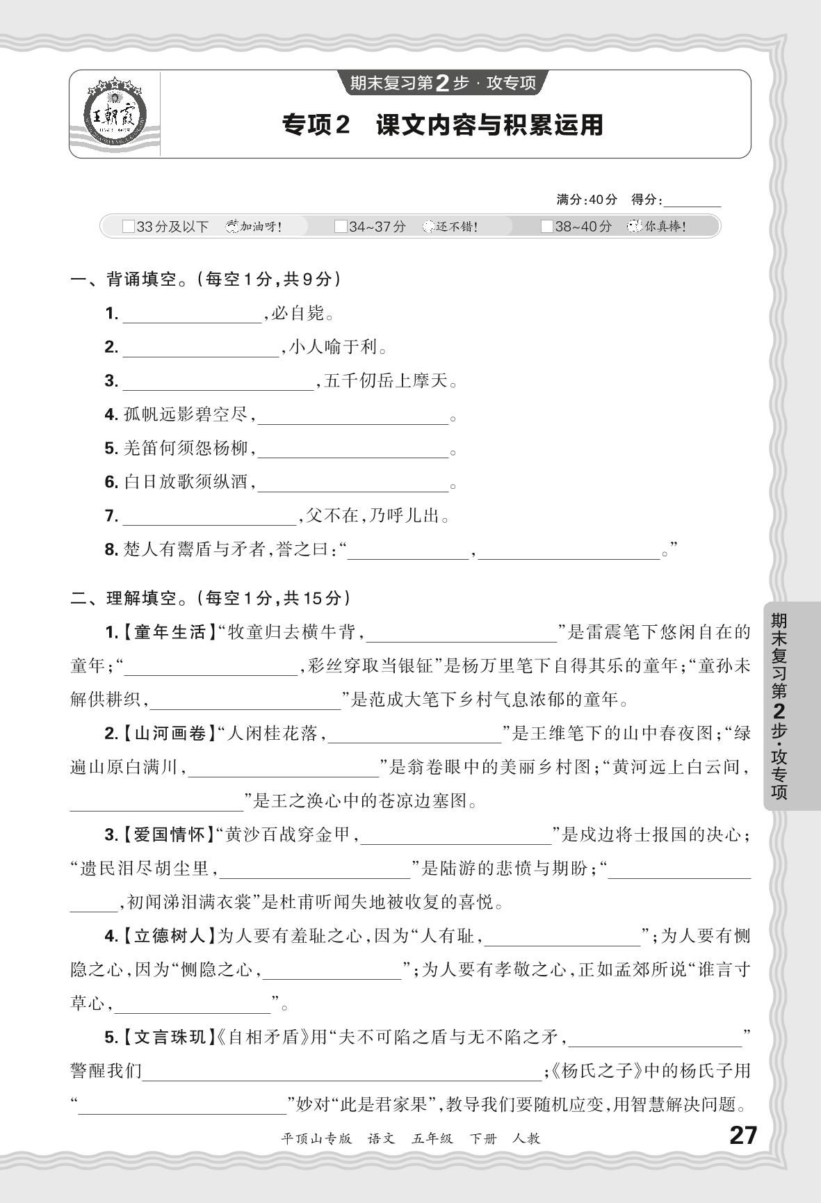 2024春下册五年级语文人教版 期末专项卷平顶山版·课文内容与积累运用【2】