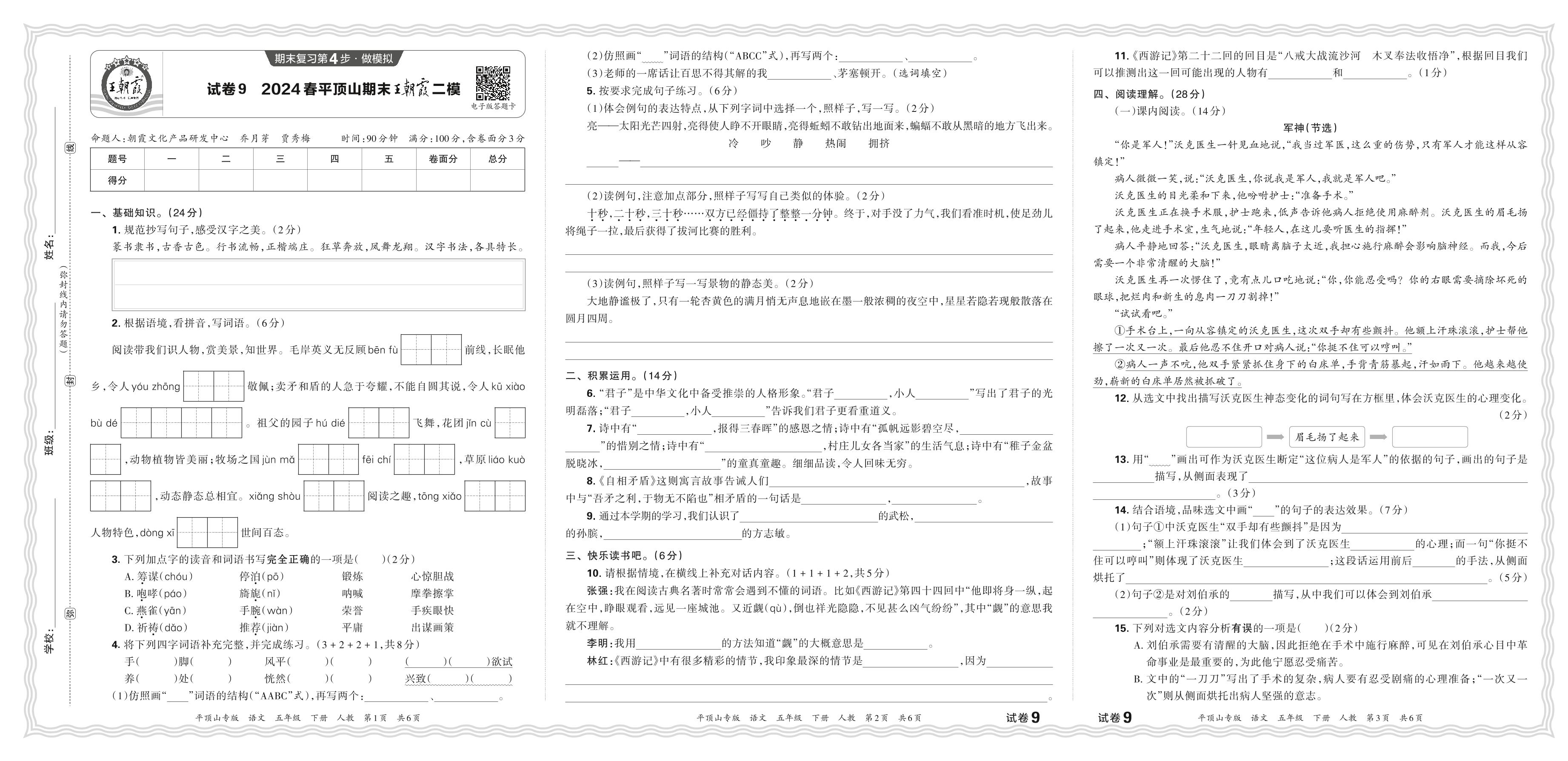2024春下册五年级语文人教版 河南平顶山期末王朝霞二模【9】