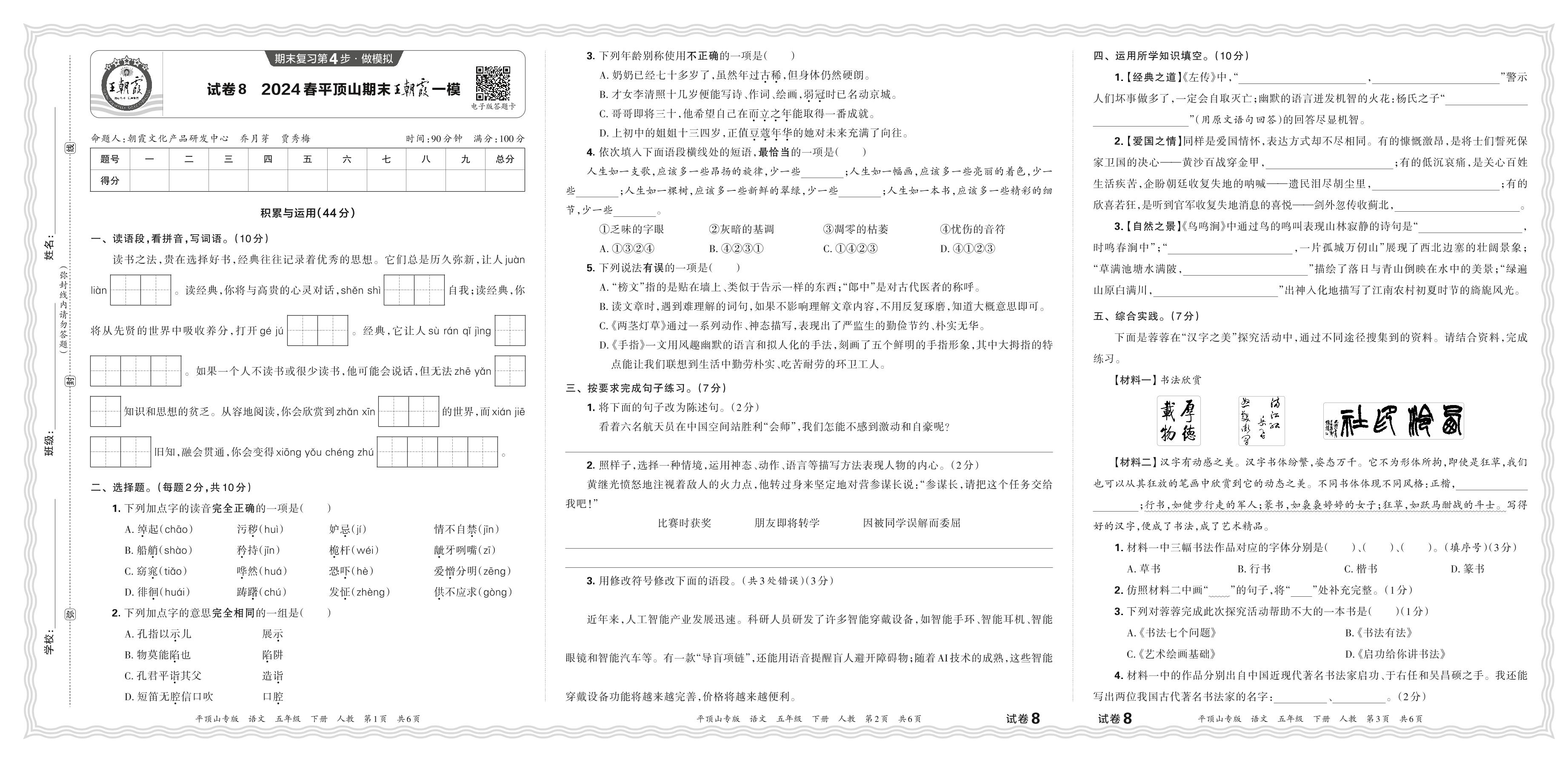 2024春下册五年级语文人教版 河南平顶山期末王朝霞一模【8】