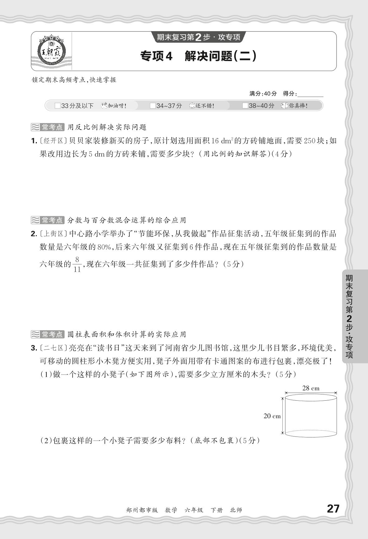 2024春下册六年级数学北师版 期末专项卷郑州版·解决问题(二)【4】