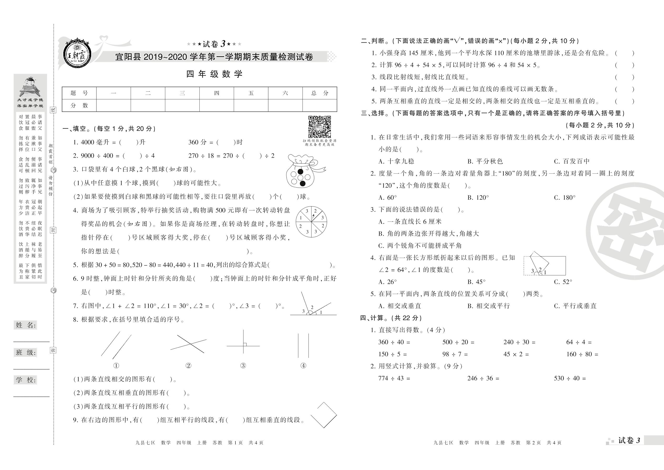2019-2020学年第一学期洛阳市宜阳县四年级数学试卷(苏教版)【3】